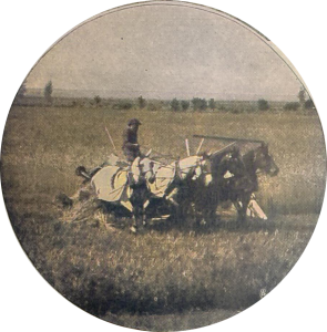 Frühmorgens, wenn der Tau noch auf den goldenen Weizenhalmen glitzert und funkelt, ziehen die Mähmaschinen, jede von zwei Mann bedient und mit vier bis sechs Pferden oder Maultieren bespannt, hinaus ins Feld. Wie eine Batterie, die zur Aktion vorgeht, wird die lange Reihe an das Weizenfeld angelegt, und dann tönt das Klipp und Klapp der Schneidemesser mit nur kurzen Pausen den ganzen Tag (Abb.). Nebenher reitet der Aufseher, und hinter ihnen folgt eine Schar von Männern, die die Garben zusammenstellen.