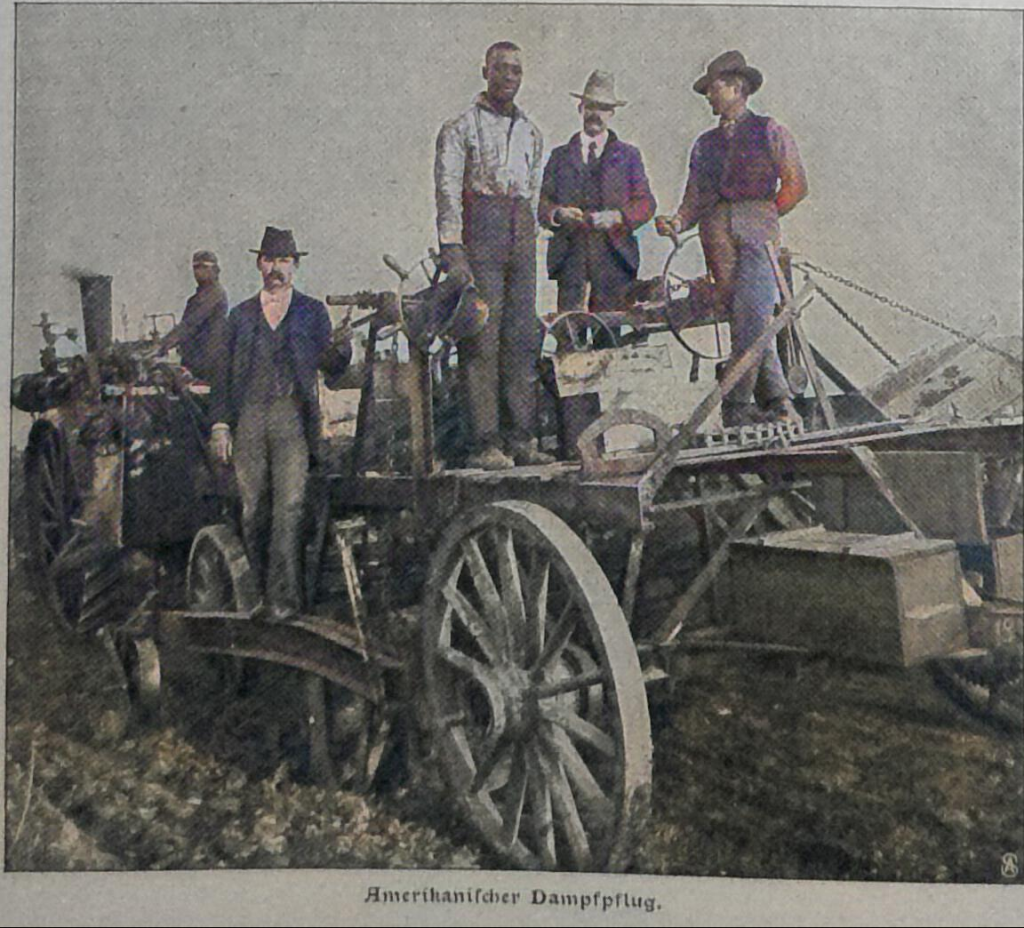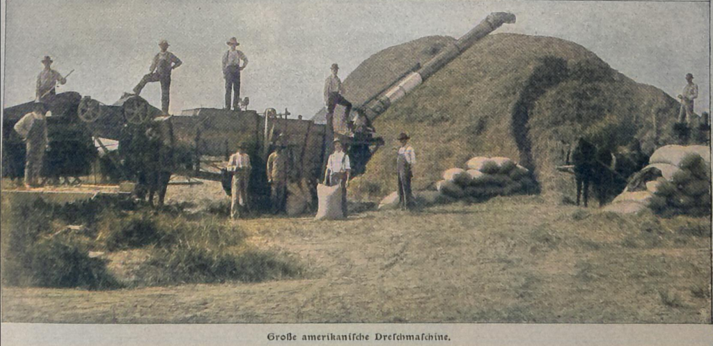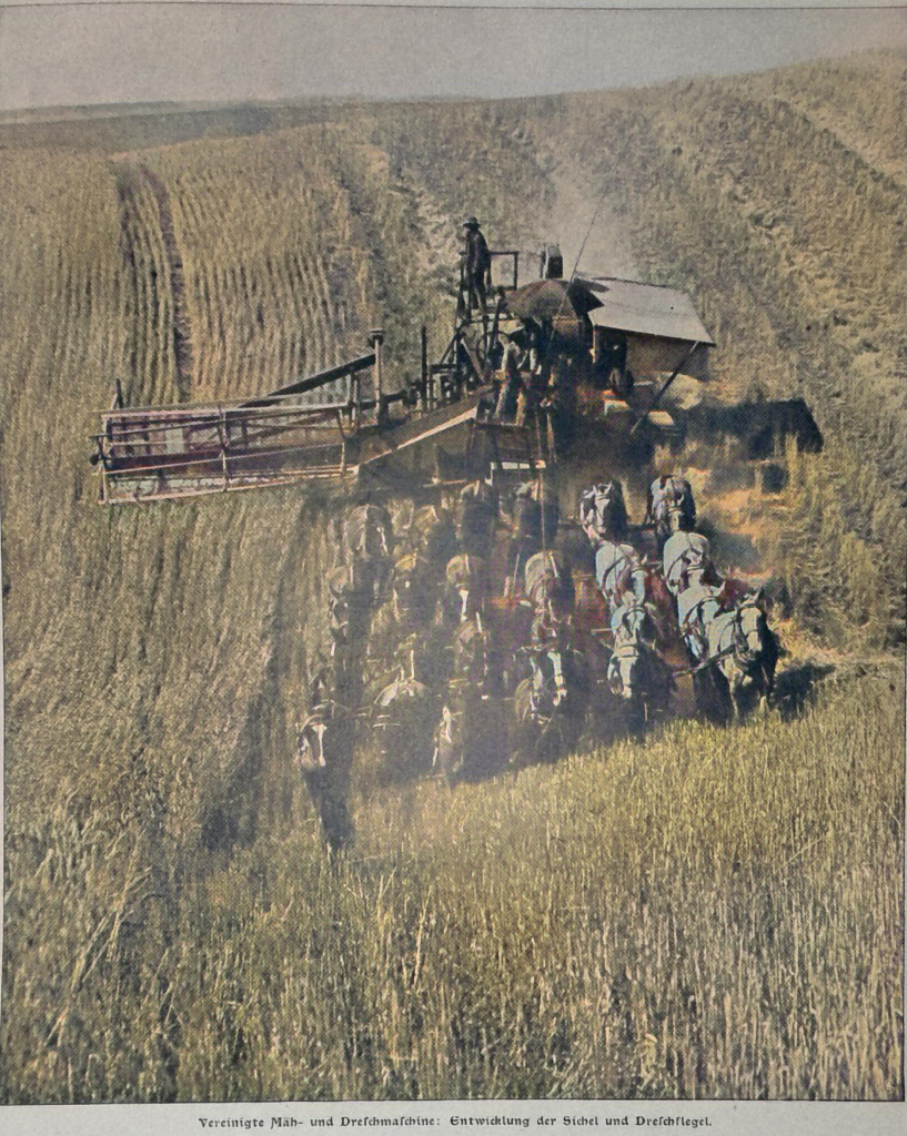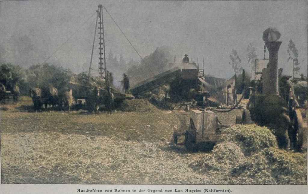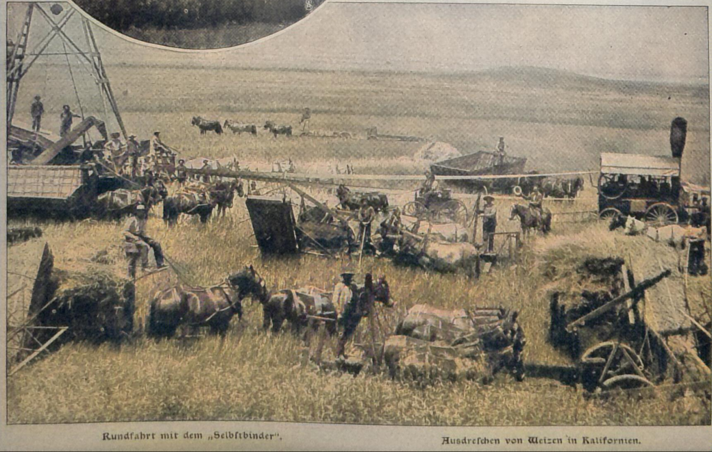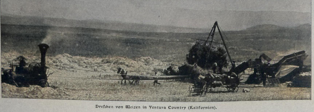Heute werden z. B. im San Joaquintal in Kalifornien Erntemaschinen benutzt, die gleichzeitig den Weizen mähen, dreschen, reinigen und in Säcke füllen, wahre Ungetüme, zu deren Betrieb eine mächtige Lokomobile oder ein halbes hundert Zugtiere notwendig sind.