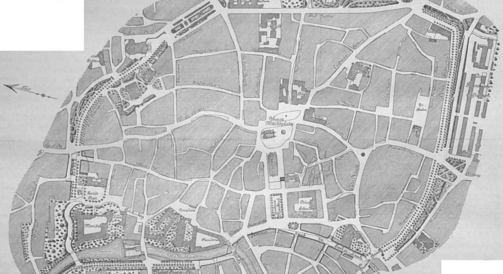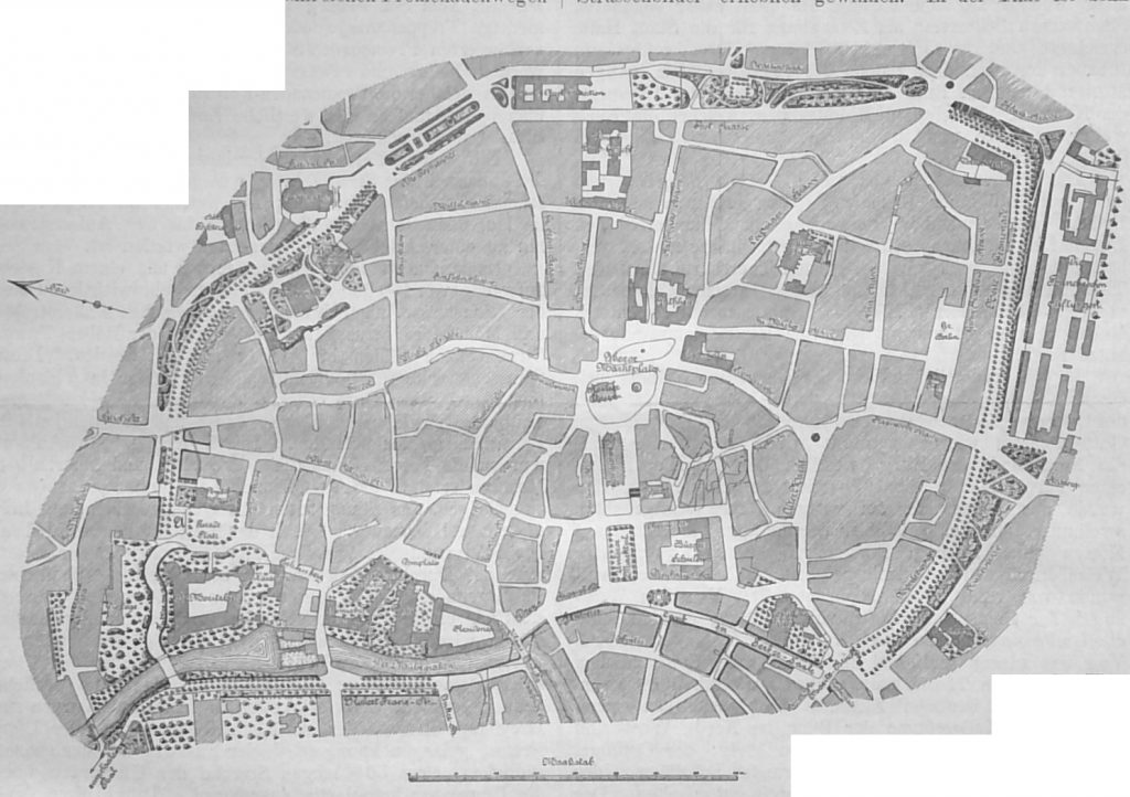 Zunächst ist, um im Norden zu beginnen, die bestehende Promenaden-Strasse, welche bisher an der Grossen Ulrich-Strasse endigte, nach Westen hin bis zum „Paradeplatz“ fortgeführt worden. Anstelle der hier früher vorhandenen, zur Universitäts-Reitbahn gehörigen alten Gebäulichkeiten ist jetzt eine mit Baumreihen versehene und mit einem Blumenparterre geschmückte stattliche Strasse vor einigen Wochen dem Verkehr übergeben worden. Die Kosten dieses Strassendurchbruchs einschliesslich der Kosten für die Erwerbung des Reitbahn-Grundstücks nebst aufstehenden Gebaulichkeiten belaufen sich zwar auf rund 230 000 M.; es ist jedoch zu erwarten, dass die Stadtgemeinde durch Verkauf der äusserst werthvollen Baustellen, welche auf der Südseite der Durchbruchstrasse, zwischen dem Garten des physikalischen Instituts der Universität und der Grossen Ulrich-Strasse noch verblieben sind, ihre Auslagen bis auf einen verhältnissmässig geringen Restbetrag zurückerhalten wird.