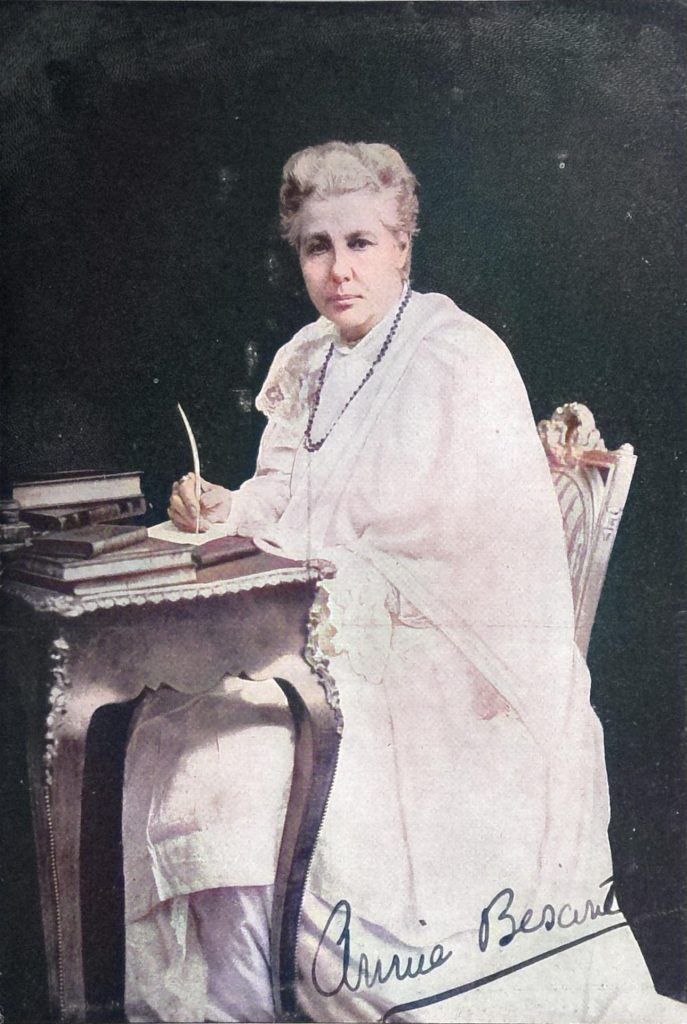 Der Schwerpunkt ihrer Thätigkeit liegt heute in Indien, wo sie daran arbeitet, den Hindus das Vertrauen zu den Lehren der uralten Weisheit zurückzugeben, ein Vertrauen, das durch das Eindringen der westlichen Kultur mit ihrer naturalistischen Richtung gefährdet erscheint. In all dem leitet sie eine edle Menschenliebe, die sie heute selbst viel höher stellt, als die andere, die sie einst dem Sozialismus in die Arme trieb.