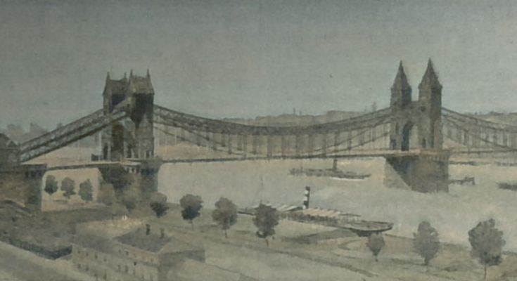 Unter den angekauften Entwürfen befinden sich zwei Hängebrücken. Der von der Maschinenbau Aktien-Gesellschaft Nürnberg, Filiale Gustavsburg, Direktor A. Rieppel und von dem Architekten H. Pylipp in Nürnberg ausgearbeitete Entwurf mit dem Kennwort „Eisenkette“ ist eine ganz ausgezeichnete Ingenieurleistung. Die Architektur ist scheinbar absichtlich sehr bescheiden behandelt, sie ist in romanischen Formen gehalten, schlicht aber etwas trocken.