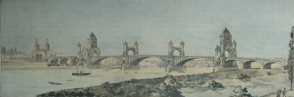 Eine vorzügliche Eisenbrücke zeigt der Entwurf, der den ersten III. Preis (3000 M.) erhielt. Er trägt das Kennwort „Wonnegau“, Die Verfasser sind die Brückenbau-Gesellschaft Harkort in Duisburg, R. Schneider in Berlin und Prof. G. Frentzen in Aachen. Die 3 Bogen von 92,04, 106,2 und 92,04 m Stützweite sind elliptisch geformt. Es sind Zweigelenkbogen und zwar je 2 Hauptträger. Die beiden Fluthbrücken bestehen aus gewölbten Viadukten. Die halbkreisförmigen Gewölbe haben eine lichte Weite von 8-2 m. Den Verfassern haben augenscheinlich die römischen Aquädukte der Campagna vorgeschwebt, die in jener weiten Ebene so überaus malerisch wirken. Eine ähnliche Wirkung hätten sie gewiss auch hier erreicht, doch würde durch die vielen Pfeiler das Fluthprofil zu sehr eingeschränkt worden sein.