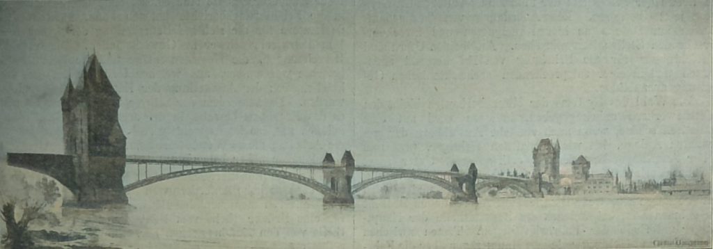 Das Vorland ist wie der Strom auf beiden Seiten durch eiserne Bogen überspannt. Die Stromöffnungen haben Zweigelenkbogen mit versteiften Zwickeln von 99, 109 und 99 m Spannweite. Es sind fünf Hauptträger angeordnet. Die Architektur geht mit der Eisenkonstruktion sehr gut zusammen. Beide Ufer sind ganz gleichmässig ausgebildet, wodurch die Gesammtansicht etwas Strenges und Akademisches erhält. So schön die im Einzelnen ziemlich reiche Architektur auch ist, so will sie unseres Erachtens nicht recht zur Landschaft passen; sie wäre in einer Grosstadt am Platze bei einer Brücke, die zwei bedeutende Stadttheile mit einander verbindet. Die Strompfeiler tragen grosse dekorative Aufbauten und auch sämmtliche Fluthpfeiler sind durch Figuren oder Kandelaber-Aufbauten geschmückt. Die Ufertreppen sind in die Pfeiler gelegt in einer Anordnung, die mit dem Reichthum der ganzen Anlage nicht harmonirt. –