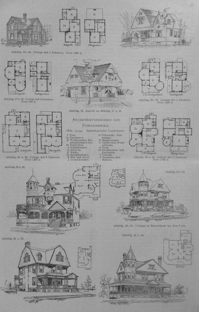 Zum Grundriss der meist wenig unterkellerten kleineren Cottages ist nur weniges zu sagen. Um den Flur, der selbst oft die Stelle des Reception-Room’s vertritt, gruppiren sich in der Regel mindestens zwei Zimmer, Parlor und Dining-Room, zu welchen bei grösseren Anlagen etwa noch eine Bibliothek und ein weiteres Wohnzimmer kommen; die Küche ist stets neben dem Speisezimmer, höchstens durch eine kleine Anrichte getrennt. Die Haupträume, einschliesslich Flur, sind meist durch breite Schiebethüren mit einander verbunden, wenn man es nicht vorzieht, auf verschliessbare Thüren überhaupt zu verzichten und somit ganz offene Durchgänge zwischen den einzelnen Räumen zu schaffen. Das Obergeschoss enthält die Schlafzimmer und das Bad; dass letztes stets mit dem einzigen Abort im Hause in einem Kämmerchen untergebracht ist, gehört jedenfalls nicht zu den nachahmenswerthen Einrichtungen! Bezeichnend ist, dass benachbarte Schlafzimmer in der Regel nicht miteinander in Verbindung stehen; sie öffnen sich nur nach dem Flur und allenfalls nach dem Badezimmer. So wenig wie bei der Küche die Speisekammer und die Veranda, so wenig fehlt bei dem Schlafzimmer der Wandschrank (Closet); man macht lieber das Zimmer um so viel kürzer, als der Wandschrank an Tiefe beansprucht, als dass man auf diesen verzichtet. Das Geschirr und das Tischzeug des Speisezimmers wird entweder in dem meist in einer Nische stehenden Buffet (Sideboard) oder (häufiger) auch in besonderem Wandschrank untergebracht, der zugleich Raum bietet für ein Waschgestell oder zur Aufbewahrung kleiner Klapptische usw. Nur jene Räume, welche mehr oder weniger Repräsentationszwecken dienen – Parlor, Reception-Room, Drawing-Room und wie sie alle heissen mögen – bleiben frei von Wandschränken, Die beigegebenen Abbildg. 14-34 enthalten für das Gesagte zahlreiche Belege; da es uns indessen zu weit führen würde, dieselben einzeln zu besprechen, so beschränken wir uns darauf, sie dem aufmerksamen Studium der Fachgenossen zu empfehlen, Es sind durchweg Holzbauten und sowohl als solche, wie als amerikanische Familienhäuser bezeichnend; mit Ausnahme jener aus Bensonhurst sind die Abbildungen alle aus den unten genannten Heften „Our New Designs“ entnommen.