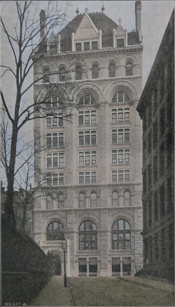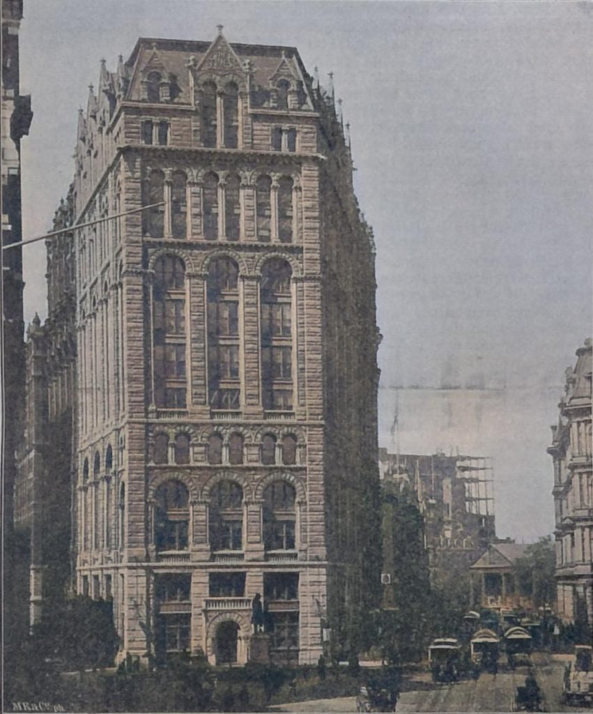 Das Riesenhaus, dessen Entwurf von Arch. William H. Hume herrührt, ist zugleich ein bezeichnendes Beispiel des romanesken Stils. Die vier unteren Geschosse bilden gewissermaassen den Sockel, die folgenden den Haupttheil der Fassade, wobei die 2 obersten die Stelle des Frieses einnehmen; über dem Gesims wird die schon vorher vorbereitete Auflösung der Fassade in Thürme und Giebel zur Thatsache. Im übrigen enthebt uns die beigegebene Abbildung einer näheren Beschreibung der Fassade; man beachte dabei, wie sich der runde Eckthurm allmählich aus der Baumasse herausschält! – Die Fassade zeigt an den Sockelgeschossen rauhbossirte rothe Sandsteinquader; ebenso bestehen alle Gliederungen und die Bogen der oberen Geschosse aus diesem Material, während im übrigen Backstein zur Anwendung gekommen ist, dessen dunkelgelbe Farbe gut mit jener des Sandsteins zusammengestimmt ist.