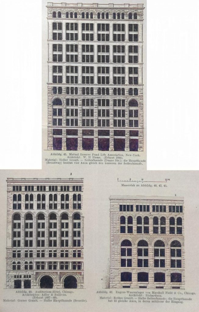 So übertrieben es ist, Richardson einen „zweiten Michelangelo“ zu nennen, wie dies seitens eines englischen Fachgenossen geschehen (Deutsche Bauzeitung 1893, S. 234), so empfindet man doch seinen Bauten gegenüber unwillkürlich den Eindruck, Erzeugnisse einer kraftvollen, selbstbewussten Künstlernatur vor sich zu haben. – Es dämmerte bereits, als ich eines Abends ziellos durch einige ziemlich menschenleere Strassen in der City Chicagos schlenderte; da stand ich plötzlich vor einem Bau, der mich durch seine trotzige Kraft, durch seine majestätische Erscheinung fesselte. Mächtige rothe Granitquader von fast 5 m Länge bei über 90 cm Höhe bildeten den Sockel, kleinere, aber fast durchgängig in rauhen Bossen vortretende Quader thürmten sich bis zur Höhe von sieben Geschossen empor, Fenster und Fenstergruppen von über 4,5 m Breite frei lassend und an den Ecken des Baues sich zu Pfeilern von 5 m Breite verdichtend. Ohne zu wissen, dass ich hier dem nach Richardson’s Entwurf ausgeführten Wholesale Establishinent von Marshall Field & Co. gegenüberstand, hatte ich den Eindruck: so hätte wohl ein Florentiner des XV. Jahrhunderts die Aufgabe gelöst, einen siebenstöckigen Geschäftsbau zu errichten. (Eine Abbildung des betr. Fassadensystems folgt im V. Abschnitt.)