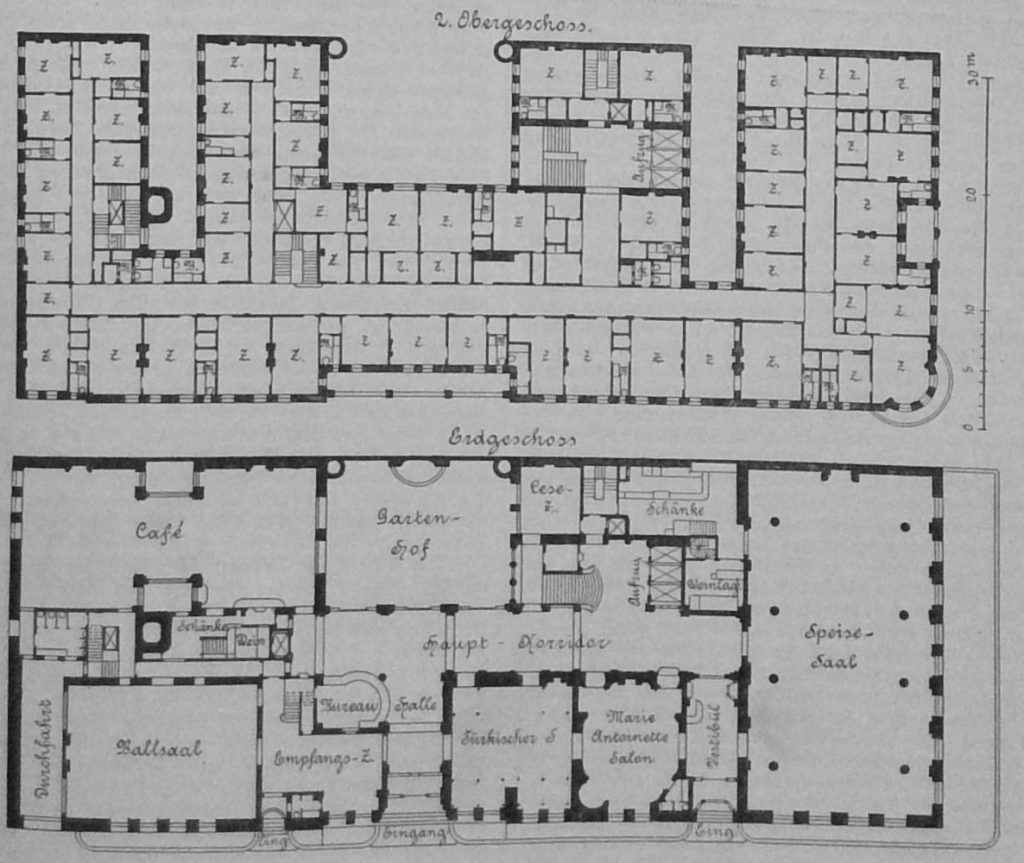 Der an der Aussenseite angeschlagene Ton deutscher Renaissance klingt innen nur in dem Frühstückssaal nach, – von der schön geschnitzten Vertäfelung und den Lüsterweibchen bis zu den Steinpappefüllungen der Kasettendecke und den – horribile dictu – gemalten Landsknechten! Die Haupträume des Erdgeschosses – besonders der Speisesaal, der Ballsaal wie der ganze Korridor – nähern sich sowohl nach Architektur wie nach Möblirung dem Empirestil; der Marie-Antoinette-Salon und der Turkish-Salon kennzeichnen sich schon durch ihre Namen. Als eine Besonderheit dieses Hotels, die sonst nicht leicht wieder angetroffen wird, ist der sog. „Gartenhof“ zu bezeichnen, der durch seine Lage gegenüber dem Haupteingang und durch seine Ausstattung mit allerlei kostbaren Vasen usw. (zumtheil hochfeine japanische Arbeiten) und prächtigen Pflanzen den räumlichen, gesellschaftlichen und künstlerischen Mittelpunkt des Ganzen bildet.