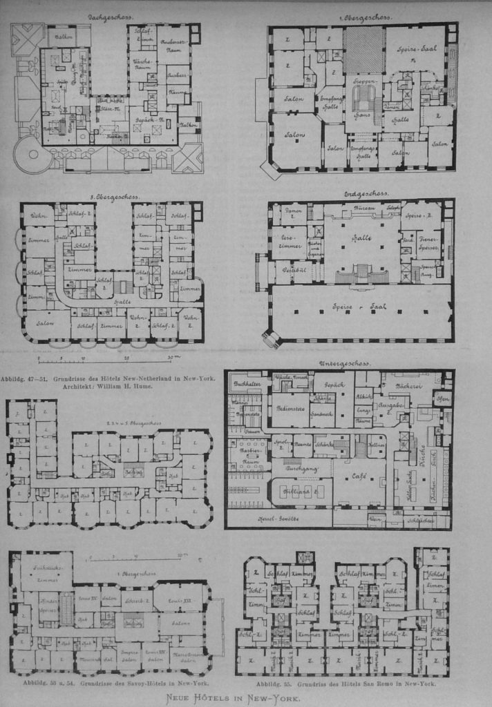 Wnn eines der New-Yorker Hotels dem eben beschriebenen hinsichtlich der Ausstattung den Rang als allererstes streitig machen könnte, so käme dafür nur das Hotel New Netherland inbetracht. Schon durch seine Lage an der Ecke des 2,5:0,5 Meilen (engl.) grossen Zentral-Parks, weitab von dem Lärm der City, ist dasselbe bevorzugt; von dem Dach der Terrasse des 234 Fuss hohen und an sich schon hochgelegenen Baues geniesst man in der That eine herrliche Aussicht über den Park und die Stadt mit dem Hafen. Das Hotel wurde erst im Juni 1893 eröffnet und ist ebenso wie das vorgenannte eine zunächst gar nicht oder schlecht verzinsliche Kapitals-Anlage der Familie Astor (der erste Pächter ist bereits in den ersten Monaten des Jahres 1894 verkracht!); die Baukosten werden auf 2,3 Millionen Doll. angegeben, wovon der 100:126 Fuss grosse Bauplatz allein eine halbe Million verschlungen hat. (Abbildg. 47-52).