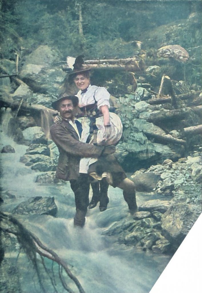Da kam im Jahr 1895 ein junger, reicher Engländer nach Tölz. Er sprach ganz gut deutsch – und das ist gewiß die Hauptsache, denn keine von unsern Almerinnen kann englisch oder weiß ganz genau, wo’s „Englische liegt“. Also der junge Tourist kraxelte eines Tags wieder auf eine Alm, sah dort die Ebnerhof- Midei, ein blutjunges Ding von fünfzehn Jahren und nebenbei ein „blutarms Leut“, aber sauber – sauber . . .! So ein Engländer schwärmt nicht lange – er ging zu dem „bluatarma Vattern“, klimperte mit einem Haufen Goldstücke, daß dem armen Teufel von Floßarbeiter ganz schwummerlich wurde – na, und dann kam das Midei als Fräulein Marie in ein feines Pensionat nach München, und in drei Jahren war sie eine wirklich pikfeine, allerliebste Städterin geworden, die heute als Frau des romantischen Engländers in der Gesellschaft sehr gute Figur macht.