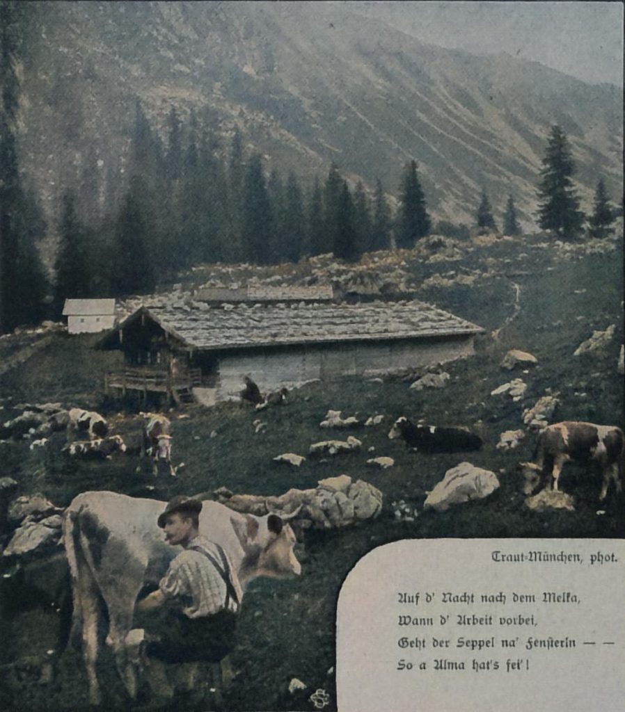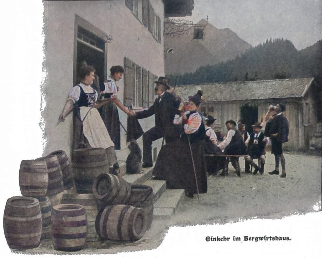 Daß uns auf den bayrischen Bergen heute noch die malerisch-schönen Trachten so vollkommen erhalten sind, ist wohl mit ein großer Anziehungspunkt für Almbesuche. Der Dank hierfür gebührt in erster Linie den Münchner Volkstrachtenvereinen, die sich ihre „Arbeitsgebiete“ ganz nach Muster der Alpenvereinssektionen in den einzelnen Teilen des Hochlandes ausgesucht haben. Hand in Hand mit der reizenden Tracht geht eine außerordentliche Reinlichkeit, von der die Bauernwirtschaften Niederbayerns, namentlich im bayrischen Wald und Tirols, nicht eben vorteilhaft abstechen.