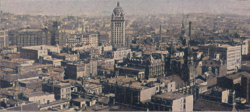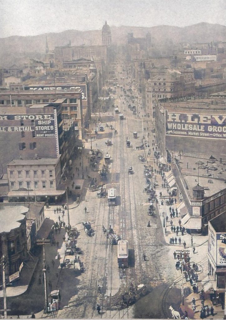 Mit dem allgemeinen Aufschwung des Landes gelangten naturgemäß auch die Städte zur Blüte.Die Hauptstadt im handelspolitischen Sinn, San Francisco, war im Jahr 1850 ein Dorf von 500 Einwohnern, heute ist es eine prächtige Stadt von über 350 000; Los Angeles, die Stadt der Orangen und Zitronen, besitzt über 200 000 Einwohner. San Francisco liegt an der Sacramentobucht unweit des „Goldenen Thores“, das den Ausgang der Bucht nach dem stillen Ozean zu bildet. Bei der Anlage der Stadt war mit großen Schwierigkeiten zu kämpfen, Hügel wechselten mit Thälern ab, ebene, leicht bebaubare Strecken waren kaum vorhanden. Es wurde viel planiert, bedeutende Sprengungen vorgenommen, aber trotzdem ist das Aussehen der Stadt noch sehr eigentümlich. Lange Straßen führen z. B. über drei bis vier Hügel und durch ebensoviele Thäler, wobei es ohne oft recht bedeutende Steigungen nicht abgeht. Die Stadt besitzt zur Zeit riesige Bauten. Namentlich die Zeitungsgebäude und Hotels zeichnen sich durch ihre Mächtigkeit aus. Das Straßenbahnsystem von San Francisco ist berühmt. Mit Neid kann der Berliner auf das außerordentlich schnelle Fahren, die schnelle Aufeinanderfolge der Wagen und ihre gute Ausstattung schauen. Der Betrieb ist teils elektrisch mit Oberleitung, teils mit unterirdischer Stromzuführung, teils nach dem Kabelsystem eingerichtet. Die Hauptstraße, Market-street besitzt vier, an einzelnen Stellen auch fünf Geleise, auf denen die „Cars“ in größter Eile dahinsausen.