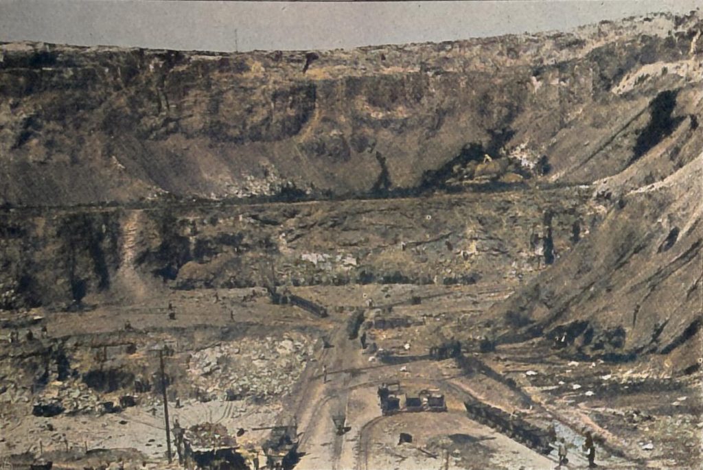 Doch zur Zeit befinde ich mich nicht im Land des Goldes, dessen Reichtum jetzt zur Bezahlung der Kriegskosten beitragen soll, sondern über dem „blauen Grunde“ des Kimberleygebiets, wo in gar nicht abzuschätzender Menge, fast möchte ich sagen, wie Rosinen in einem Kuchenteig, die Diamanten in allen Stadien und Formen der Krystallisation, große und winzige, wasserhelle und topasgelbe, eingebettet sind. Man hat für diese Diamantgebiete den Ausdruck „Diamantfelder“ gebraucht. Das ist eigentlich nur insofern richtig, als ein Teil des ziemlich umständlichen Prozesses, der für die Diamantgewinnung notwendig ist, sich auf großen Aeckern vollzieht, die thatsächlich in ganz ähnlicher Weise umgepflügt werden, wie die Saatfelder des Bauern. Ganz kurz möchte ich diesen Prozeß beschreiben. Zunächst einige Jahre, nachdem ein gewisser O’Reillys auf dem Tisch in Schalk van Niekerksfarm – es war im März 1867 – unter blanken Flußkieseln aus dem Vaal den ersten südafrikanischen Diamanten, der einen Wert von etwa 10 000 Mark besaß, gefunden hatte und der Diamantreichtum des Landes nicht mehr bezweifelt werden konnte, bearbeitete man die Minen ausschließlich von der Erdoberfläche aus, wie dies ja zum Teil, d. h. bis es aus bergbautechnischen Gründen nicht mehr angängig ist, auch heute noch geschieht. Diese offenen Minen, in die man wie in einen Riesenkrater hineinblickt, machen einen ganz wunderbaren Eindruck. Ganz genau kann man am Rand bis zum Boden des Kraters, wo man, einem beweglichen Ameisenhaufen gleichend, Hunderte von schwarzen Menschenwesen hämmern und schaufeln und die auf Schienen gehenden kleinen Eisenwagen schieben sieht, die Bodenschichtungen verfolgen; eine Kalkschicht, der wertlose „gelbe Grund“ (Thon), der „blaue Grund“, der die diamanthaltige Schicht bildet, und schließlich der harte Basalt- und Quarzmantel, der den keilförmig sich ins tiefste Erdinnere hineinsenkenden bläulich-gelben, etwas bröckligen Diamantthon einhüllt, die Mine also gewissermaßen in Form eines steinernen Riesenbeckens oder Kessels abgrenzt. Kleine und große Wasserbäche rieseln hie und da in die Tiefe und werden, da sie der Mine nachteilig und durch die sogenannten Modderrushes, die sie veranlassen (Schlammstürze in die unter, irdischen Tunnels und Schächte), im höchsten Grad gefährlich sind, nach Möglichkeit abgelenkt und durch Pumpanlagen unschädlich gemacht.
