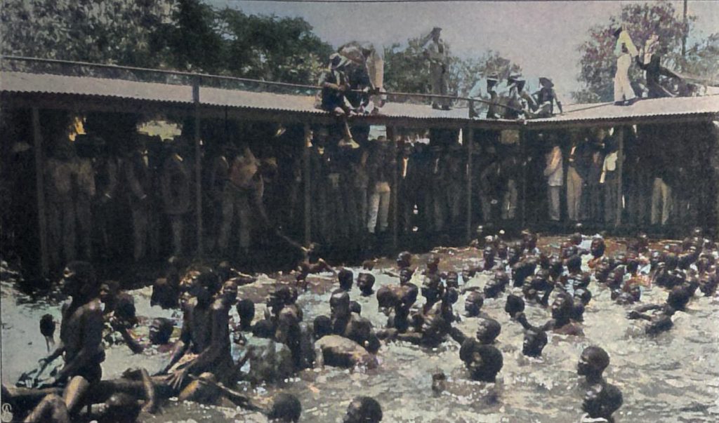 Auf den Europäer macht die Sache – über dies Gefühl vermag wohl keiner hinwegzukommen, der die Compounds besucht – einen deprimierenden Eindruck, weil man die Vorstellung der frei, selbstwillig und dabei recht hart Arbeitenden mit dem Begriff der Gefangenschaft nicht recht zu vereinigen vermag. Das Gefühl wird nur wenig gemildert, wenn man durch Beobachtung die Anschauung gewinnt, daß diese Schwarzen heute noch eine Mischung zwischen kleinen Kindern und großen Affen sind. Man muß zugeben, daß es diesen Leuten gegenüber keinen andern Schutz vor Diamantdiebstählen, die immer noch vorkommen, giebt, als dies System der Ueberwachung, das schließlich in eine mehrtägige „Detention“ ausläuft, während der die Hände in Lederfutterale eingeschlossen und noch andere scharfe Diebstahlsbehinderungen in Anwendung gebracht werden. Manches entzieht sich der Beschreibung. Man hört auch, daß selbst das nicht die diebischen Gelüste der Schwarzen unterdrückt. Der Aufseher in dem Detentionsraum erzählte mir, daß kürzlich ein Kaffer sich eine Wunde am Unterschenkel beigebracht, darin 35 Diamanten verborgen und schließlich einen Fetzen aus seinem Hemd als Pfropfen hineingesteckt hatte, auch die Qualen, die infolge der unvermeidlichen Entzündung der Wunde verursacht wurden, mannhaft trug, bis endlich Entdeckung erfolgte. Dabei werden von der De Beersgesellschaft für jeden Diamanten, der als gefunden abgegeben wird, 10 Prozent des Wertes vergütet. Der Wert solcher gefundener Steine soll sich jährlich auf rund 8 Millionen Mark belaufen. Man wird auch fernerhin bei der Beobachtung dieser Arbeiter inne, von welch enormer Bedeutung die zwangsweise Enthaltung von Alkohol ist. Alles Erdenkliche können die „Boys“ in den Compounds sehr billig kaufen Fleisch, Delikatessen, Kleidungsstücke – nur keinen Schnaps. Wenn sie sich heimlich aus Mealies sogenanntes Kaffernbier selbst brauen, das ihnen übrigens auf ärztliche Verordnung als Skorbutverhütungsmittel zuweilen verabreicht wird, werden sie bestraft. Moralisch und physisch ist das von vortreffem Einfluß. Ferner werden die Leute nicht in die Compoundslager geschickt, wie Verbrecher in ein Gefängnis. Sie schließen einen Arbeitsvertrag auf Monate oder Jahre. Indem sie ihn schließen, wissen sie genau, welcherlei Freiheitsbeschränkungen ihrer warten, daß selbst ihre Weiber und Kinder das Lager bloß bis zur Schwelle betreten dürfen. Dann wird ins Feld geführt, daß die wirtschaftliche Schädigung der Handelswelt einer Stadt, wie Kimberley, durch die Monopolisierung des Verkaufs innerhalb der „Camps“ nicht so groß ist, wie man annimmt. Die De Beersagesellschaft hat sich dem Staat gegenüber verpflichtet, alle Waren, die den Lagern verkauft, so weit dies möglich ist, aus Kimberley zu beziehen. Endlich – und das ist die Hauptsache – muß festgestellt werden, daß von einer unmenschlichen Behandlung der Schwarzen in den Compounds, entgegen früher vielfach ausgesprochenen Behauptungen, nicht die Rede sein kann. Der Eindruck des Lebens, das sich dort abspielt, ist vielmehr beinah ein wohlthuender. Die Leute wohnen und ernähren sich dort besser, sauberer, als in ihren Krals. Für gemeinnützige Institute, Hospitäler, Schule, Gottesdienst ist gesorgt. Es geht ein fröhlicher Zug durch die Gesellschaft. Einige wenige blieben bis zu 15 Jahren in ihren Arbeitskontrakten.