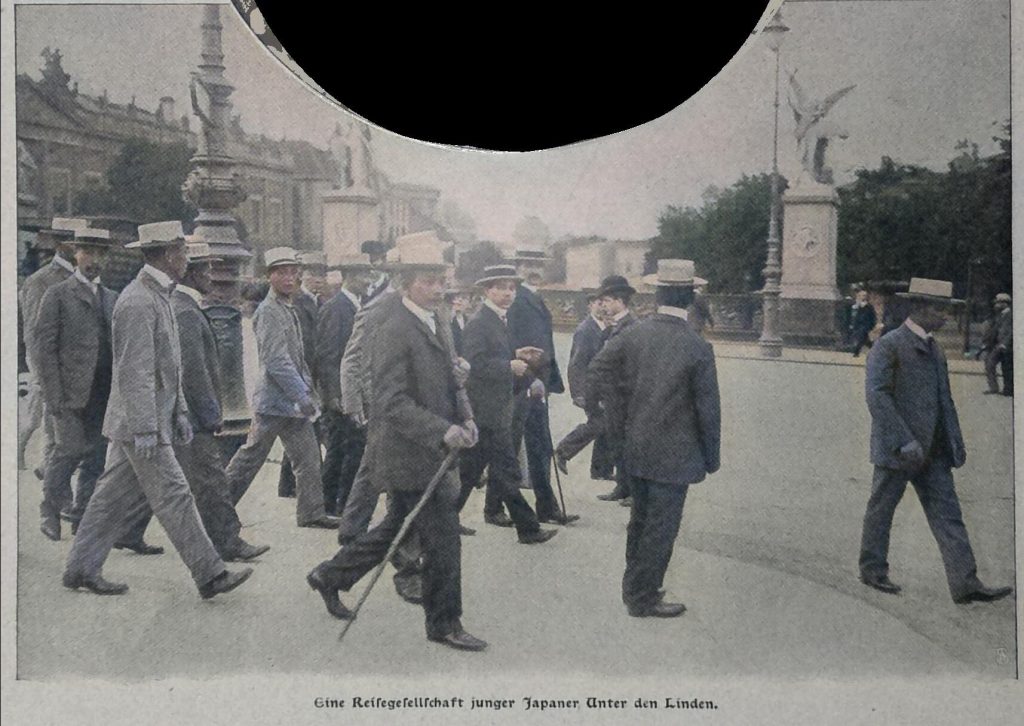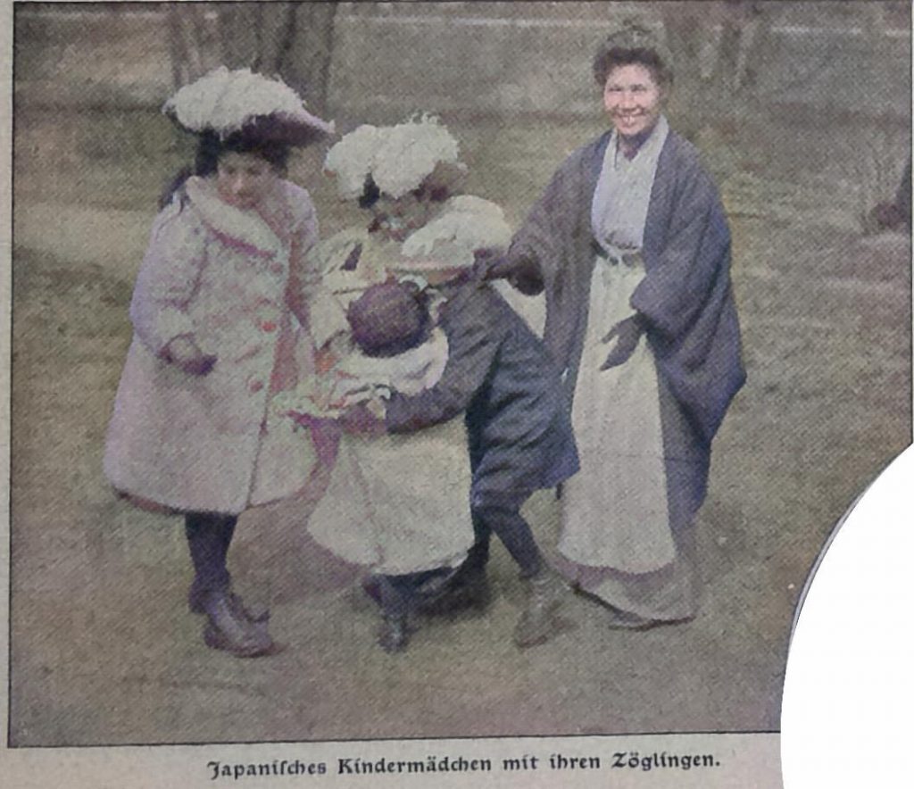 Aber es gibt keinen deutschen Gau, kein europäisches und außereuropäisches Kulturland, von dem nicht eine mehr oder minder große Zahl von Angehörigen dauernd in Berlin lebt. Natürlich fallen in einem Zeitalter, das die Kleiderfrage der Kulturmenschen zwischen Nord- und Südpol einheitlich geregelt hat, diese fremden Kolonisten im Straßenbild nur dann auf, wenn sie abweichende Körpereigenschaften oder fremdartige Kostüme zeigen und aus diesem Grund führt uns der photographische Apparat auf den beigefügten Augenblicksaufnahmen auch nur exotische Volkstypen vor. Betrachten wir zunächst die Japaner. Vor Ausbruch des jüngsten Krieges war die japanische Kolonie Berlins sehr beträchtlich. dann aber rief das Vaterland fast alle Mitglieder heim, und erst nach und nach beginnen sie nun wieder nach Berlin zu kommen. Die Söhne Nippons, zumeist Studierende und Ingenieure, haben sich mit ihrem stark ausgeprägten Nationalgeist hier ein ganz hübsches Nest zu bereiten verstanden; sie halten gut zusammen, finden ihren gesellschaftlichen Mittelpunkt in einem Klub vornehmen Stils und können sich, wenn es ihnen beliebt, in einem eigens zu diesem Zweck begründeten Privatspeisehaus die dem Europäer nicht ganz verständlichen Erzeugnisse japanischer Nationalküche zu Gemüte führen. In der Oeffentlichkeit tragen die Japaner natürlich vollkommen abendländische Tracht, nur die heitere Kindermaid, die unsere Aufnahme zeigt, ist dem bequemen heimischen Kimono treu geblieben – und mit Recht, denn im modernen Kostüm verliert eine Japanerin gar zu viel von ihrer natürlichen Anmut.