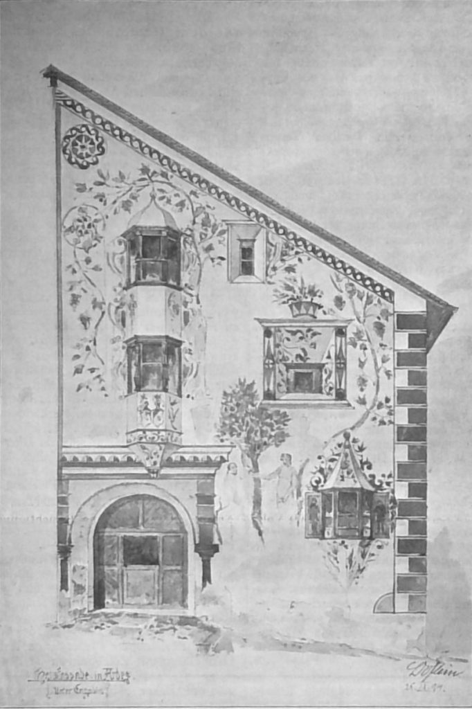 Die Ausbeute ist sonst gering, doch sind in Ardez die Reste alter Herrlichkeit an gemalten Fassaden zu schauen. Das reizende bemalte Haus (Abbildg. 13), das ich dort fand und um dessentwillen ich die Post weiter fahren liess, um bei recht schlechtem Wetter eine Skizze zu machen, möge den Beschluss meiner Mittheilungen bilden. Es zeigt die Form eines halben Giebels nach der Hauptstrasse, das Thor und die Fenster sind in der uns schon bekannten, Anordnung gehalten. Von den beiden Erkern indessen ist der eine am Erdgeschosszimmer als Fenster-Erker behandelt, der andere entwickelt sich unregelmässig über dem Thor durch zwei Geschosse als richtiger Erker; beide haben halbsechseckige Grundrissform. Die Freskobemalung der Fassaden, in flotter, sicherer Weise ausgeführt, zeigt an de Ecke eine schwarze Quaderung mit trennenden rothen Strichen auf weissem Grund. Die Fenster sind in gleichen Farben architektonisch umrahmt, auf die Schrägflächen aber sind Blumenkörbe und Blumenranken in bunten Farben aufgemalt. Auch das bogenförmige Thor hat eine Umrahmung, aus kurzen Säulchen, Quaderung und schwerer gerader Verdachung bestehend, vom Maler erhalten.