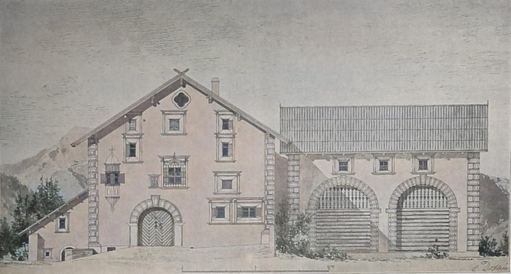 Es erübrigt noch, die Orte von Samaden bis zur Grenze des Engadins gegen Tirol zu durcheilen. Da finden wir in dem nächsten Ort einen Versuch aus jüngster Zeit, in der überladenen Fassade eines Hotels die ältere Technik nachzuahmen. Von den folgenden Orten zeichnet sich Zuz durch ältere Häuser, auch ein Planta’sches, aus. Ein Fremdling in diesen Gegenden, ein richtig verzimmerter und in geschnitzter Holzarchitektur gebildeter überhängender Giebel findet sich in Lavin.