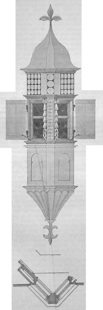 Die Vorkragung und der Unterbau sind mit frei modellirtem Stuck verziert, ebenso die meist in eine lilienartige Bekrönung endigende Verdachung des Erkers. Soweit die Fenster, die äussere Läden haben, reichen, ist der Erker aus Holz gearbeitet und oft sehr zierlich mit Schnitzarbeit versehen. Reicht der Erker bis zum Fussboden des Zimmers herunter, so ist ein Sitzplatz darin.
