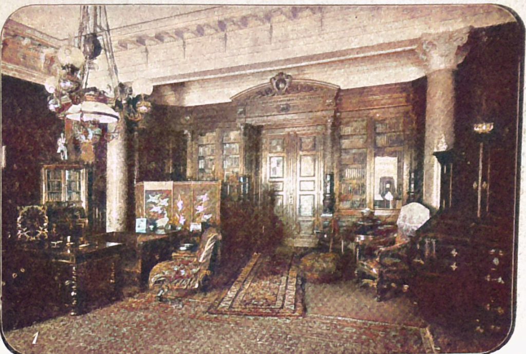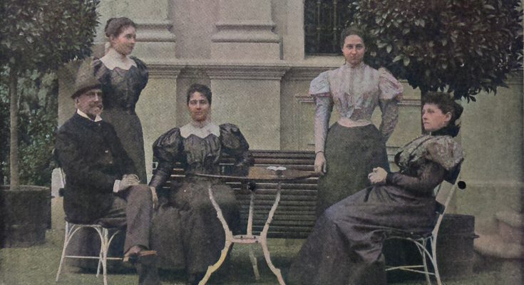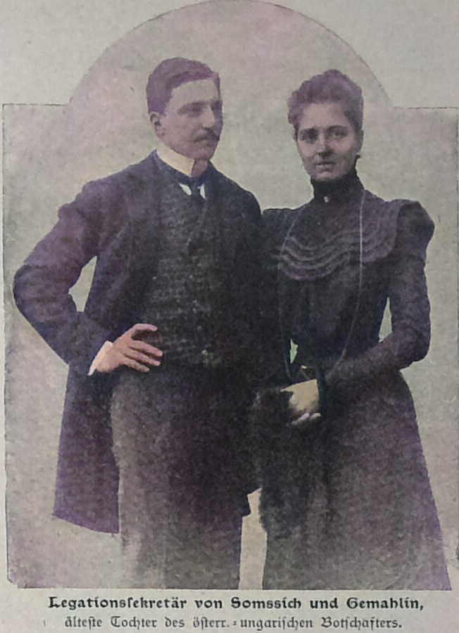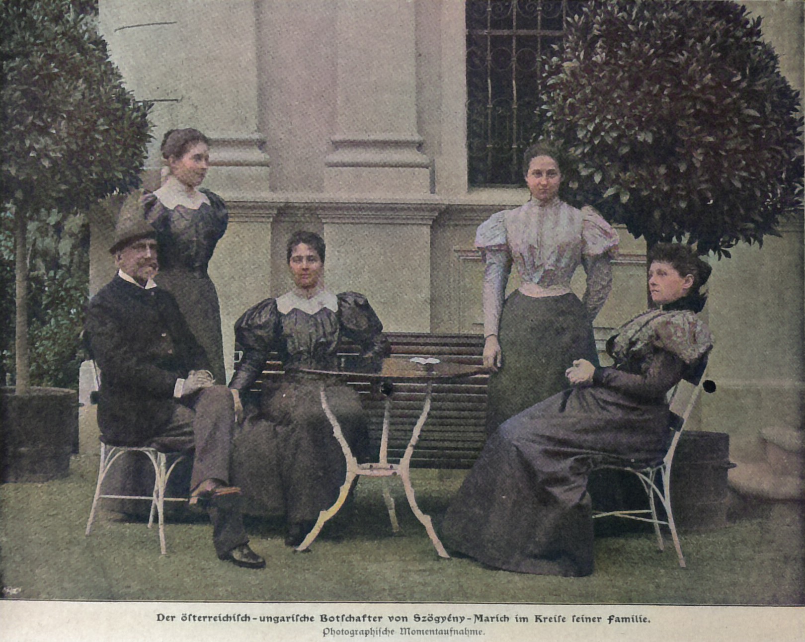 Unsere Bilder zeigen den Botschafter und seine Familie in seinem Heim. Im Hochparterre des Palais befinden sich außer dem Speisesaal und den Salons auch das Empfangzimmer und das Arbeitzimmer des Botschafters, im ersten Stockwerk die Salons der Frau von Szögyény-Marich und die Wohnräume der Familie. Ein anmutendes Bild zeigt den Botschafter mit seiner Familie im Garten sitzend. Die älteste Tochter Kamilla vermählte sich bekanntlich im vorigen Jahr mit dem Legationssekretär an der hiesigen Botschaft Grafen Somssich. Unmittelbar hinter dem Vater steht auf unserm Bild Fräulein Mariska (Marie) und neben der Mutter die jüngste Tochter, Fräulein Lilli von Szögyény-Marich.