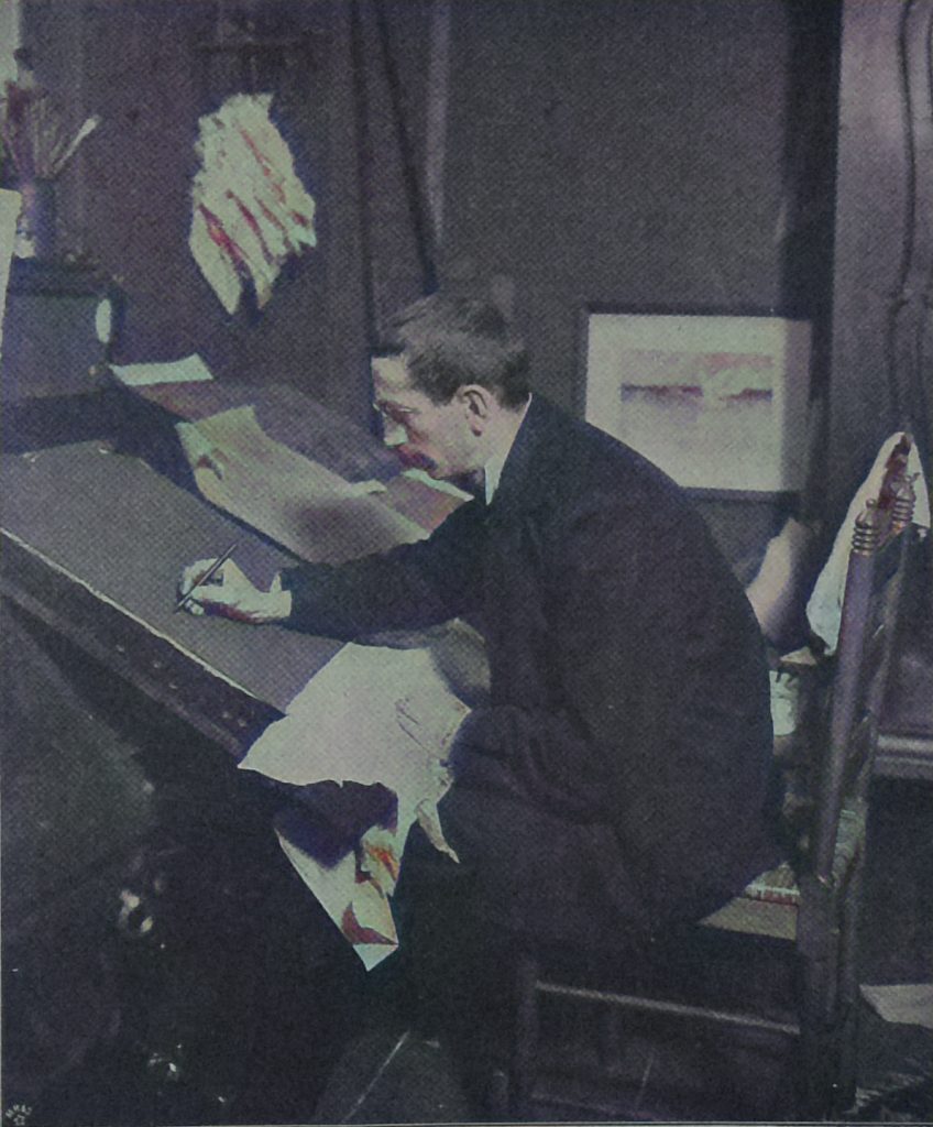 So ist Eckmann in seiner kunstgewerblichen Thätigkeit zugleich Maler, Bildhauer und Architekt. „Etwas Unpraktisches kann nie schön sein,“ ist einer der wichtigsten und führenden Grundsätze des Künstlers. Das Material wählen nach den Zwecken, denen es dienen soll, und es diesen Zwecken dienstbar machen, die Ornamentik nicht etwa willkürlich aufkleben, sondern organisch den Formen des Ganzen anpassen und einfügen, hierin liegt das stets erneute Suchen und Streben Eckmanns, der von der Natur die Motive, von der Zweckbestimmung des einzelnen Werkes die Methode ihrer Verwendung abnimmt. Gegenwärtig befinden sich auf der Pariser Ausstellung die Musikmöbel, Konzertflügel, Pulte und Notenständer, die Eckmann für die Hochschule für Musik im Auftrag der Regierung entworfen hat. In den Schlössern der Vornehmen und in den Salons der Reichen prunken die silbernen Schmuckgeräte, die er geformt hat, und alle Großindustrien des Kunstgewerbes fahnden nach seinen Arbeiten und Entwürfen.