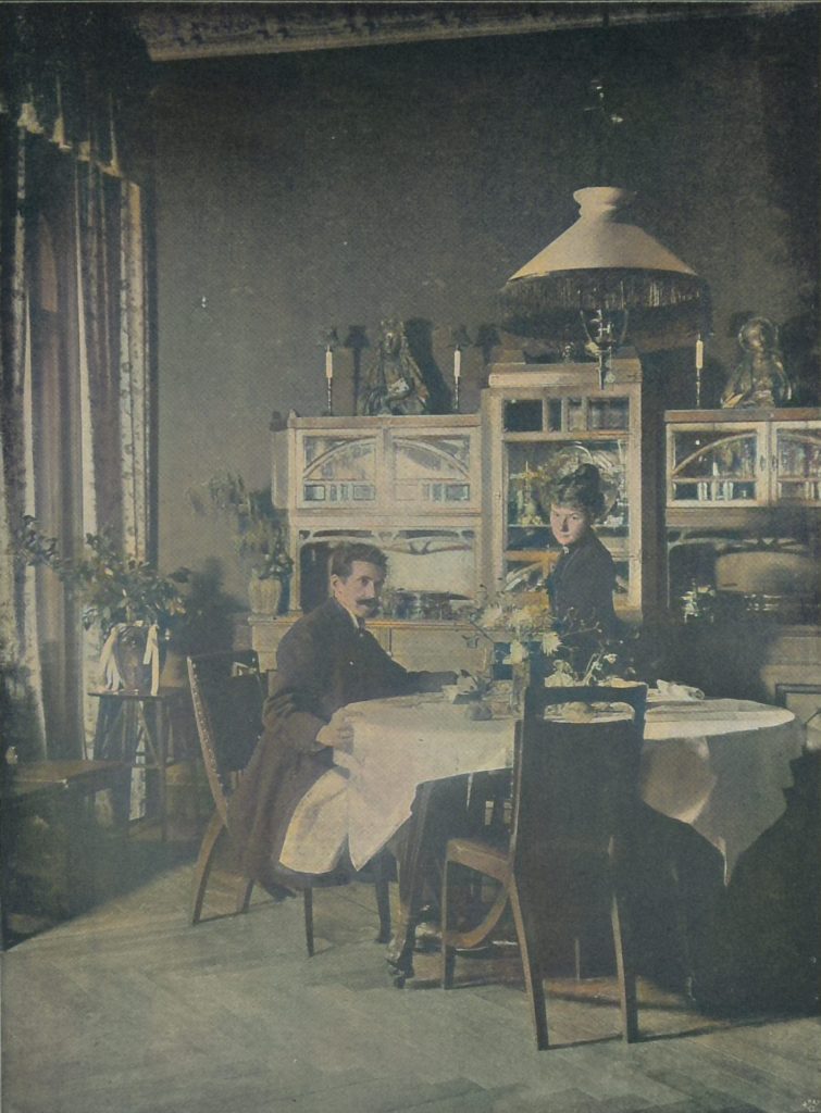 Unser erstes Bild führt uns in das Speisezimmer Otto Eckmanns, das ganz nach den eigenen Entwürfen des Künstlers eingerichtet ist. Alle Möbel zeigen neue, eigenartige Formen, und alle diese Formen haben neben dem originalen Liebreiz etwas Anheimelndes, Behagliches. Man hat das Gefühl, auf diesen Stühlen möchte sich s bequem sitzen, dieses bürgerliche Büffett beherberge gute Sachen für Gaumen, Kehle und Magen, an diesem Tisch müsse sichs angenehm tafeln lassen. Und diesem Eindruck strebt auch mit vollem Zweckbewußtsein die Kunstarbeit Eckmanns entgegen, die er in seinem großen Atelier im ersten Stockwerk des Kunstgewerbemuseums für sich und als Lehrer seiner Schüler leistet. Ist Eckmanns Wohnung ein reizender Schmuck· und Schaukasten seines Wirkens, so macht der hohe, helle Arbeitsraum des Ateliers den ernsten und imponierenden Eindruck der Vielseitigkeit einer Arbeit, die alle kunstgewerblichen Gebiete beherrscht und sich den großen Weltmarkt erobert hat. Auf dem mit Papieren und Zeichnungen überladenen Schreibtisch stehen in Flaschen und Vasen getrocknete Zweige mit Blumen, Blättern, Knospen, aus denen Motive für Ornamente gewonnen werden. An den Wänden Skizzen zu Landschaftsbildern, dann begonnene und vollendete Tapetenmuster in ruhigen, vornehmen und durchaus originalen Farben und Formen. Auf Gestellen modellierte Thonarbeiten für Geräte aus Glas, Porzellan, Terracotta, Silber und Bronze, auf Zeichentischen Konstruktionszeichnungen für Möbel – ein Museum des Werdenden.