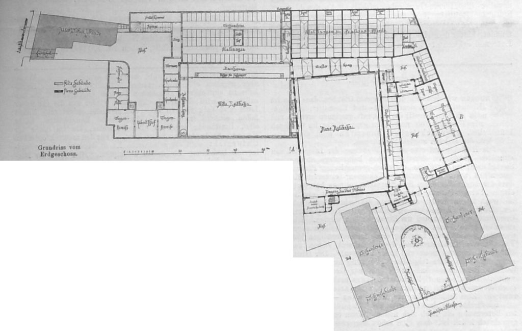Wie der Grundriss zeigt, bestand die alte Anlage, abgesehen von dem Vorderhause am Schiffbauerdamm und den kleineren, um den breiten Hinterhof angeordneten Neben-Räumlichkeiten, im wesentlichen aus 2 Haupttheilen: der grossen 40 m langen und 26 m breiten Reitbahn und einem tiefen, 4 Reihen Pferde enthaltenden, an die Längsseite der Reitbahn angeschlossenen Stallgebäude. Indem diese alte Reitbahn auf eine Breite von 21 m eingeschränkt wurde, ward zwischen ihr und den Ställen ein breiter Durchgang gewonnen gewonnen, der das alte Grudstück mit dem neuen in unmittelbare Verbindung setzt.