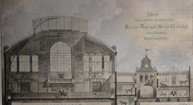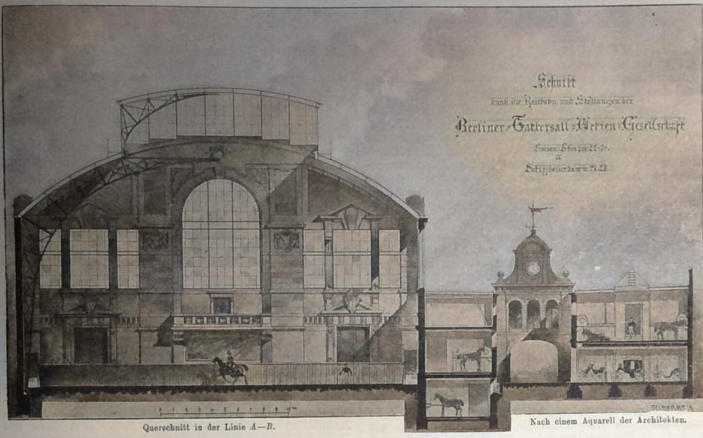 Luisenstrasse No. 22-24 und Schiffbauerdamm No. 28. Architekten: Blumberg & Schreiber. Die Berliner Tattersall-Aktien-Gesellschaft, deren Anstalt ursprünglich auf einem am westlichen Ende der Georgenstrasse, zwischen dieser und der Spree durchgehenden Grundstück sich befand, besass seit dem Jahre 1874 noch eine zweite, gleichartige Anlage, die sie auf dem geräumigen Hinterlande des Grundstücks, Schiffbauerdamm No. 28 durch den Baumeister Kohn hatte errichten lassen.