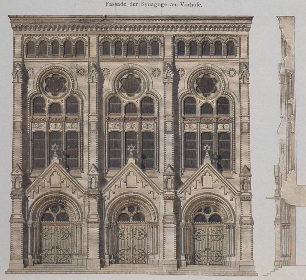 Eine breite, nach der Strasse zu durch ein Gitter geschlossene, nach dem Vorhofe geöffnete Halle, welche die unteren Geschosse des Vorderhauses durchbricht, sorgt für eine ausgiebige und würdige Verbindung der Synagoge mit der Aussenwelt und ermöglicht es dem auf der Strasse Vorübergehenden, wenigstens einen Durchblick auf die einzige Schauseite derselben zu gewinnen – ein Motiv, das in dem ursprünglichen Entwurf der Architekten noch stärker betont war. In demselben war nämlich das Vorderhaus in zwei völlig getrennte Hälften getheilt, die Schauseite der Synagoge demnach an einen nach der Strasse geöffneten Vorhof verlegt was jedoch aufgegeben werden musste, da eine Trennung der Räume für die Religionsschule als unzulässig angesehen wurde. Das eigenartige Moment dieser Gesammt-Anordnung aber ist, dass die Axe des Vorderhauses bezw. des Vorhofes mit derjenigen der Synagoge selbst nicht übereinstimmt; die Front der letzteren tritt nämlich nur als ein dreiaxiger Bau in die Erscheinung, während das Gotteshaus in Wirklichkeit 4 Axen besitzt. Diese „architektonische Täuschung“, welche dem Besucher des Gebäudes natürlich ebenso unmerklich bleibt, wie die nicht ganz parallele Lage beider Axen, vor allem aber der Umstand, dass dabei in die Axe der Synagoge ein Pfeiler fällt, hat – wie wir nicht verhehlen wollen – einzelnen, besonders gewissenhaften Vertretern des Fachs zu Bedenken Veranlassung gegeben, während die durch sie ermöglichten Vortheile es andererseits wohl gewesen sein dürften, die dem Entwurf der Architekten s. Z. den Sieg verschafft haben.