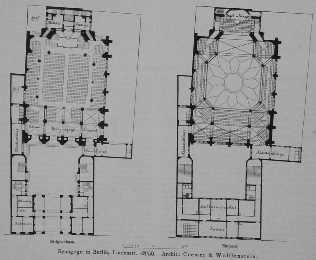 Die Synagoge steht also inbetreff der Gesammtzahl ihrer Plätze den entsprechenden Bauten zu Breslau, Danzig und München annähernd gleich und wird nur von der hiesigen Haupt-Synagoge in der Oranienburger Strasse übertroffen.