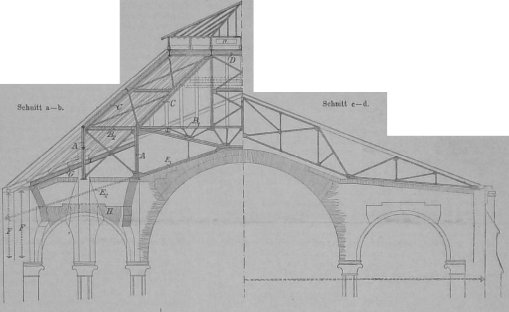 An den Fachwerkbinder B1 sind nun die Anker E, für die Hauptgurtbögen in geneigter Stellung angehangen und, nach Anschluss an den Stielfuss A, in gleicher Richtung E2 bis zu den Frontwänden verlängert. Hier wird die nöthige Auflast durch den lothrechten Anker F erzeugt.