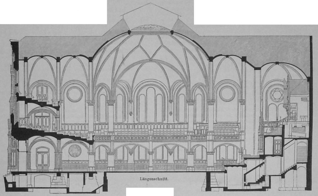 Auch die Anordnung der letzteren weicht von der des ursprünglichen Entwurfs nicht unwesentlich ab. In diesem Entwurf bestand der Innenraum aus einem überhöhten Mittelschiff von 2 mit Oberlichten versehenen Gewölbefeldern, welches auf 3 Seiten von Nebenschiffen umgeben wurde, Die grosse Tiefe dieser, auf den Seiten-Emporen nicht weniger als 7 Sitzreihen enthaltenden Nebenschiffe hätte es für die Inhaberinnen zahlreicher Empore-Plätze unmöglich gemacht, die Kanzel und den Thora-Schrank zu sehen, was nach der Auffassung der hiesigen Gemeinde als unzulässig gilt. Statt jener Langhaus-Anlage wurde daher unter entsprechender Steigerung der Raumwirkung eine Zentral-Anlage mit 18 weitem, von einer Oberlicht – Kuppel überspanntem Mittelraum, schmaleren Seiten- Emporen und einer tieferen West-Empore gewählt; für die durch die Verringerung der Emporen – Grundfläche verloren gegangenen Plätze wurde Ersatz beschafft, indem über den hinteren Theil der grossen West-Empore noch eine zweite Empore (mit 210 Plätzen) angelegt wurde. Die Zahl der Sitzplätze, denen bei einer Breite von 53 cm eine zwischen 93 und 95 cm wechselnde Tiefe gegeben worden ist, beträgt programmgemäss sowohl im unteren (Männer-) Raum wie auf den (Frauen-) Emporen je rd. 900, während auf der Orgel- und Sänger-Empore hinter dem Allerheiligsten noch 50 Plätze vorhanden sind.