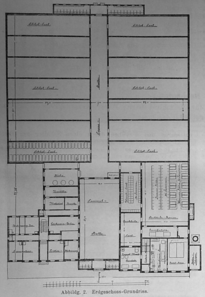Links vom Haupteingang liegt das Verwaltungshaus mit Beamtenwohnungen (Abb. 2). Dieser Theil besteht abweichend von den übrigen Theilen des Gebäudes, die lediglich aus Erdgeschoss (Shedbauten) bestehen, aus Erdgeschoss, 2 Obergeschossen und Dachboden. Das Erdgeschoss enthält die Wohnung des Hausvaters, des Pförtners und ein Konferenzzimmer. Es steht mit der Sammelhalle in unmittelbarer Verbindung. Vom Konferenzzimmer aus ist auch eine Verbindung nach einem an der Sammelhalle liegenden Krankenzimmer ermöglicht. In den Obergeschossen befinden sich 8 Beamtenwohnungen von je 2 Stuben, Küche und Kloset.