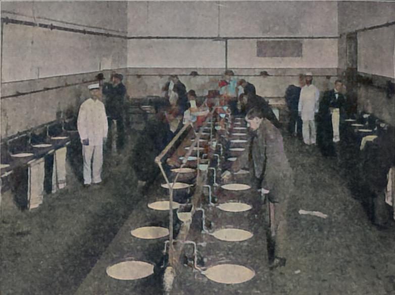 Diese werden in Gruppen von 60 Köpfen in den Waschraum eingelassen, wo 60 Waschbecken für Kalt- und Warmwasser vorhanden sind (Abbildg. 6). Für die Fussreinigung ist eine besondere Spülungsvorrichtung vorgesehen. Vom Bade- wie vom Waschsaal treten die Asylisten an einem Aufnahmeschalter vorbei in die 5 m breite, in der Längsaxe des Gebäudes liegende Speisehalle von 50 m Länge, die mit Tischen und Bänken für 300 Personen versehen ist. In einem Vorraum ist links der Küchenschalter; er vermittelt die Verbindung der Speisehalle mit der Küche, in welcher Dampf-Kochkessel für 400 l Suppe, 200 l Kaffee und 50 l Milch eingerichtet sind. Im Speiseraum wird abwechselnd gespeist; diejenigen, welche ihre Kleider auszubessern wünschen, können länger verweilen und erhalten das Material hierzu von der Hausverwaltung.
