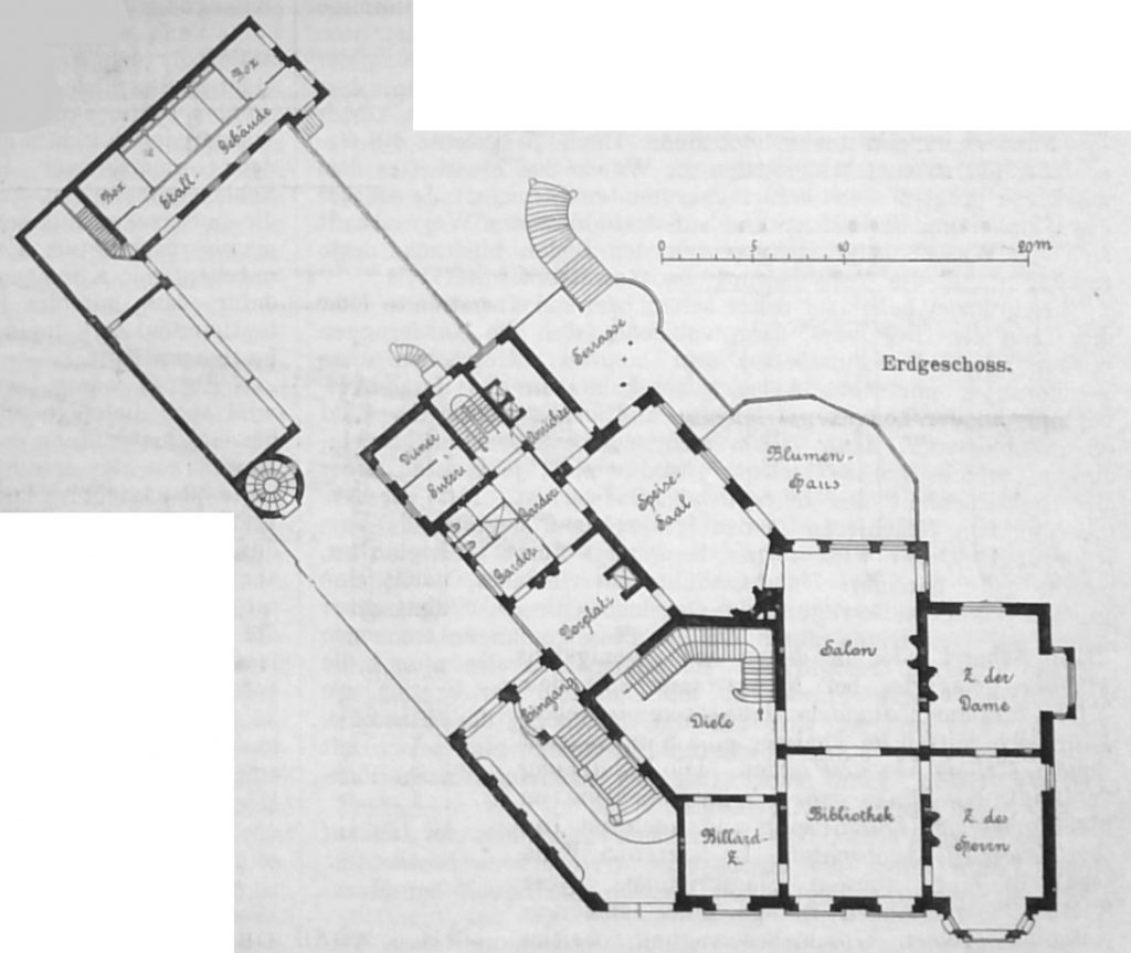Für die Grundriss-Lösung erwuchs eine wesentliche Schwierigkeit daraus, dass zur Schonung dieses Gartens der hintere Theil des Gebäudes parallel der Nachbargrenze geführt werden musste und dass diese Grenze mit der Strassenflucht einen sehr stumpfen Winkel bildet. Die Ausgleichung der hierdurch bedingten Schiefwinkligkeit ist in ebenso einfacher wie meisterhafter Weise bewirkt worden, indem sowohl der Einfahrtshalle, wie der Diele und dem Speisesaal eine fünfeckige Form (ein Parallelogramm erweitert durch ein Dreieck) gegeben wurde. Den stumpfen Winkel in der Gartenfassade verdeckt ein grosses Blumenhaus, durch welches zugleich eine zweite Verbindung zwischen Salon und Speisezimmer hergestellt ist.