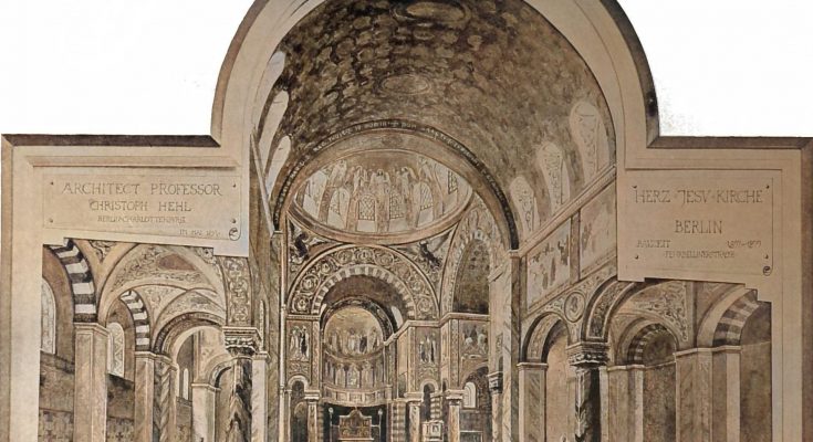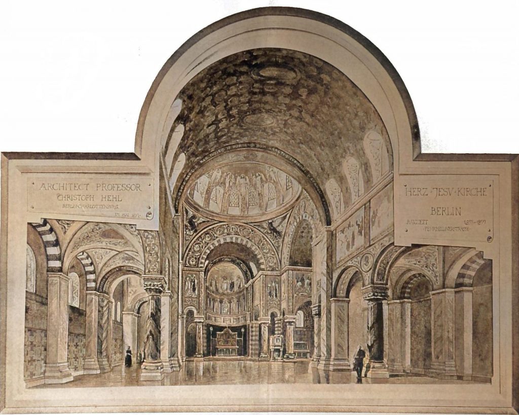 Als die Herz-Jesu-Gemeinde in Berlin den Architekten Professor Christoph Hehl in Charlottenburg mit der Aufstellung eines Entwurfes für das neue Gebäude betraute, unternahm sie es im Hinblick auf seine hervorragende künstlerische Vergangenheit. Die Wiederaufnahme des romanischen Stiles, sowohl in seiner Blüthe wie auch in seinen strengeren, stark von frühchristlichen Einflüssen durchsetzten Ausbildung, die erhöhte Werthschätzung seiner einfachen Monumentalität, die ihm eigenthümliche künstlerische. Oekonomie, welche den aufzuwendenden Mitteln eine willkommene Grenze steckt, der strenge und doch wiederum nicht asketische Ernst, der aus den in den Formen dieses Stils mit Verständniss und Gefühl errichteten Bauten spricht, erschienen gleich einer kleinen Zahl anderer Künstler auch Hehl als so grosse Vorzüge für unsere Kirchen, dass er es schon bei früheren Bauten unternahm, dem Entwicklungsbilde des neueren Kirchenbaues, welches etwas einförmig zu werden drohte, durch Aufnahme dieses Stiles neue Formen und neue Farben zuzuführen. Der Bau der Herz-Jesu-Kirche in Berlin darf als ein neuer bemerkenswerther Versuch in dieser Richtung betrachtet werden.