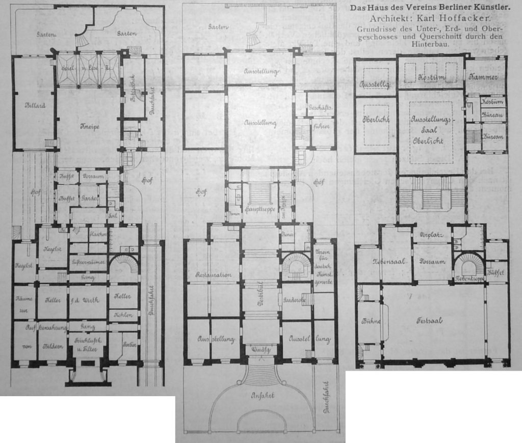 Architekt: Professor Karl Hoffacker-Charlottenburg. Als am Morgen des 15. Oktbr. ds. J. auf dem neuen Künstlerhause in der Bellevuestrasse die Fahnen in die Höhe stiegen und lustig im Winde flatterten, da verkündeten sie den Schaaren zur Einweihungsfeier zusammenströmender Festgäste, dass nunmehr eine Jahrzehnte lange Periode nomadenartiger Wanderschaft abgeschlossen und die Berliner Künstlerschaft in eine bleibende Stätte eingezogen sei.