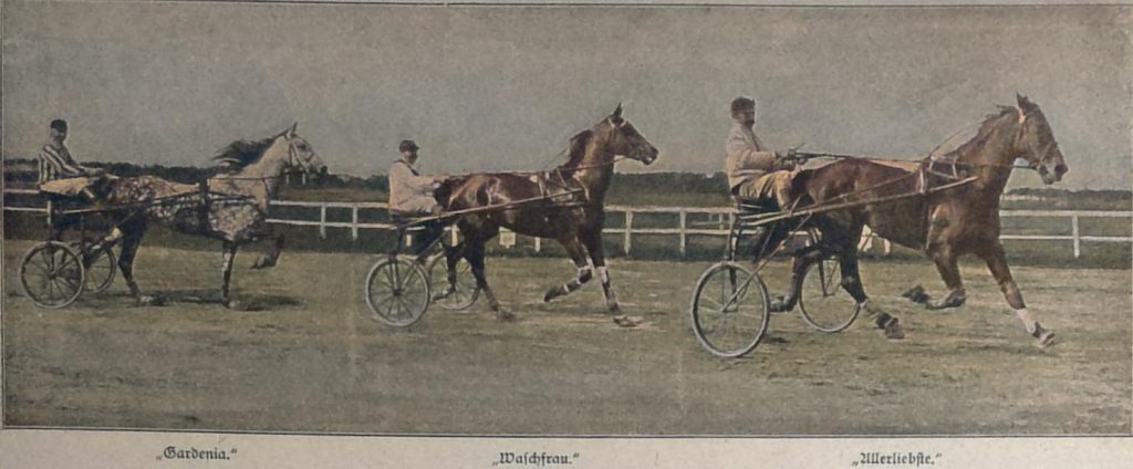 Eigentlich volkstümlich, wie etwa in Wien, sind die Trabrennen in Deutschland nicht geworden. Sie beschränken sich im wesentlichen auf Berlin und Hamburg, und alle Mühe einflußreicher Gönner – des Prinzen Salm-Horstmar, des Grafen August Bismarck, des Generals v. Podbielski und anderer – hat nicht ausgereicht, das Interesse weiter Kreise für diesen volkswirtschafllich nicht unwichtigen Sport zu gewinnen. Mit der Zeit wird sich das ändern. Das Berliner Equipagenpferd ist hinsichtlich seiner Geschwindigkeit auch von wohlwollenden Leuten gewiß niemals hoch eingeschätzt worden, seit aber das Fahrrad erfunden wurde und gar der Motorwagen, beginnt selbst der Harmlose einzusehen, daß dies Tier als Mittel zur raschen Fortbewegung auf die Dauer keine Existenzberechtigung hat. Und da es eine Traberzucht giebt, die ungefähr dreimal schnellere Pferde produziert – Tiere, die vor leichtemn Wagen auf glatter Landstraße mit jedem Personenzug konkurrieren – so wird der Traber im modernen Drängen nach immer schnellerem Vorwärtskommen wohl doch noch einmal eine Rolle spielen.