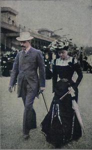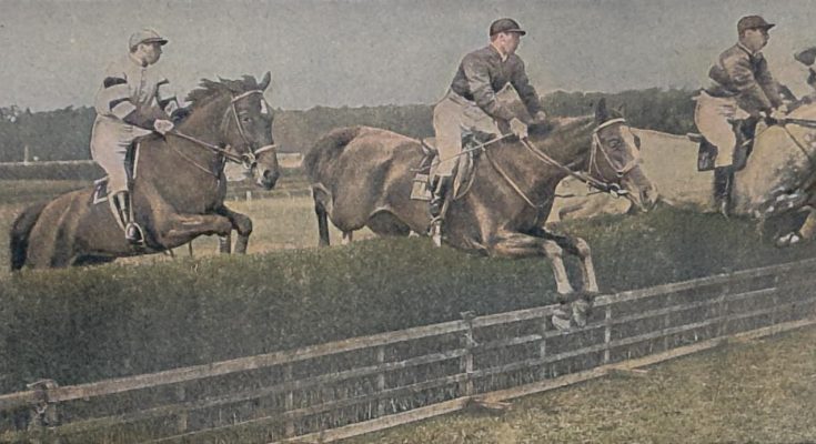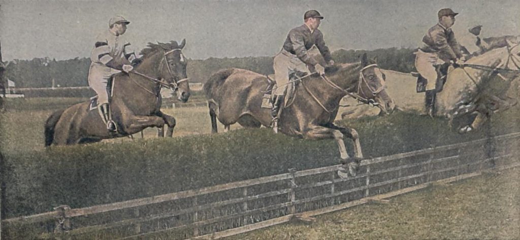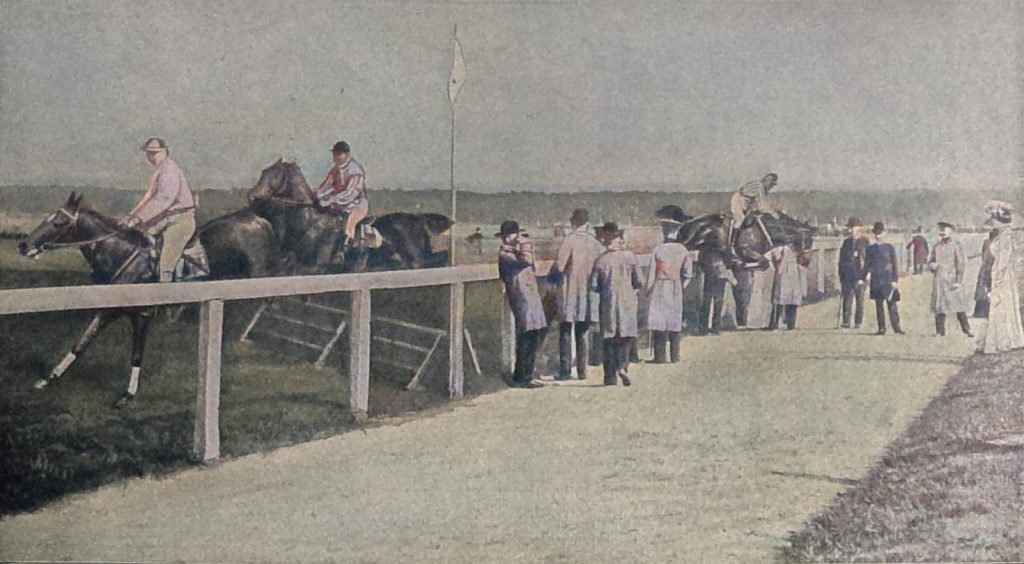 Er fehlt fast bei keinem Meeting und nahm am letzten Renntage die Offiziersteeplechase im Innern der Rennbahn in Augenschein. Uebrigens gab es an einem der letzten Renntage eine Scene voll heilloser Aufregung, da im ersten Rennen einer der Hengste unmittelbar vor den Tribünen die Hürde zu nehmen sich weigerte, nach links fortbrach und mit einem respektablen Satz über die Barriere schräg springend mitten in das dichtgedrängte Publikum hineinfegte. Ein entsetzter Aufschrei der Damen, ein wildes Auseinanderstieben, dann war das kleine Intermezzo, bei dem der arme Gaul wahrscheinlich ebenso viel Schrecken empfand als die Flüchtenden, glücklich zu Ende. Alles in allem ist es eigentlich ein Wunder, daß auf den Rennplätzen das Publikum so selten zu Schaden kommt, denn die Vollblutpferde, die wahrhaftig nicht lauter Lämmer sind, werden auf dem Sattelplatz so ungeniert durch die Menge geführt und geritten, und manch harmloser Besucher geht oder steht so unmittelbar hinter den Tieren, daß man mehr als einmal das ängstliche Gefühl hat, eins der hinten ausfeuernden Pferde werde dem Nächstbesten den Kopf zerschlagen. Daß trotzdem dergleichen eigentlich nie sich ereignet, ist wohl mehr der Vorsicht der Tiere als der Menschen zu danken. Sie wissen wahrscheinlich auf einen Zentimeter abzumessen, wie weit der Hieb der Hufe nach rückwärts ohne Gefahr für unschuldige Zuschauer sich ausdehnen darf.