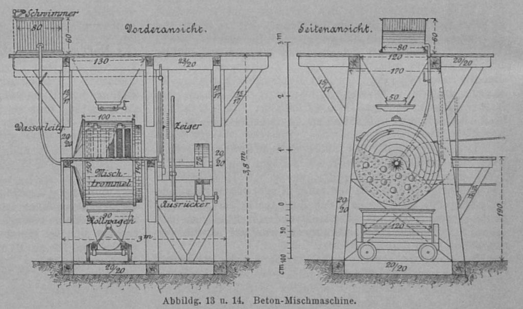 Nachdem in dieser Trommel die etwa 2 Minuten lang dauernde, trockene Mischung der Betonmaterialien vollzogen war, wurde durch die hohle Trommelaxe die erforderliche Wassermenge durch eine feine Brause eingespritzt; nach weiteren 3 Minuten Drehung der Trommel war die 0,6 cbm messende Betonmischung fertig; die Herstellung von 1 cbm Beton kostete, ohne den Aufwand für Aufstellung der Maschine und des Transportgerüstes nur 1,76 M.