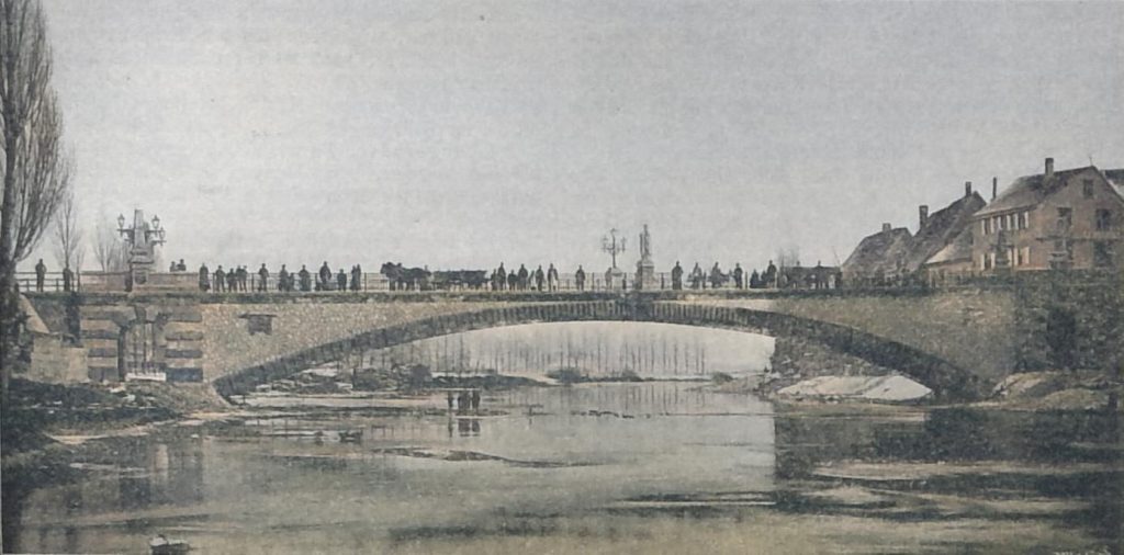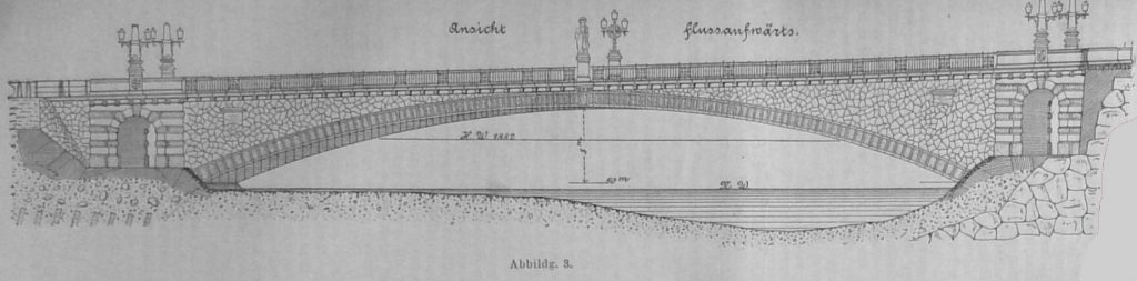 Der erste von der gen. Stadtgemeinde aufgestellte Entwurf, bei welchem die Donau mit 2 Bögen von 24 und 27 m Weite überspannt werden sollte, wurde mit Rücksicht auf die schwierige und theure, 6 m unter Niederwasser reichende Gründung des Mittelpfeilers von der staatlichen Ober- Aufsichtsbehörde nicht gut geheissen und der Stadtgemeinde ein auf Staatskosten umgearbeiteter Entwurf zur Ausführung empfohlen.