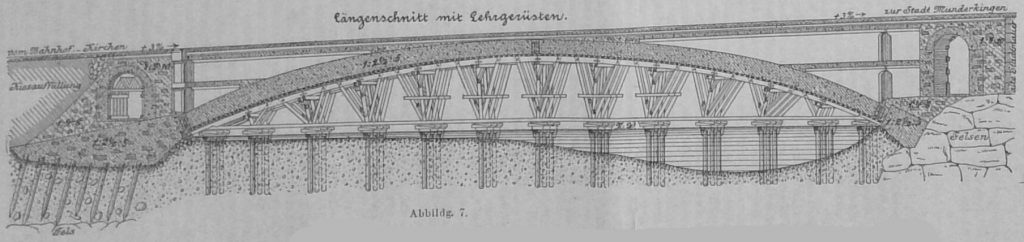 Es war ursprünglich beabsichtigt, den Bogen aus Sparsamkeitsrücksichten bei Wiederverwendung der Gerüsthölzer in 2 Hälften zu wölben; der Kürze der Bauzeit wegen wurde jedoch hiervon abgesehen.