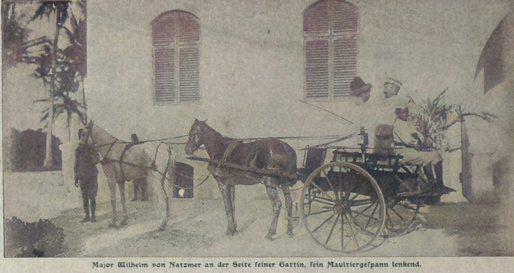 Major Wilhelm von Natzmer an der Seite seiner Gattin, sein Maultiergespann lenkend