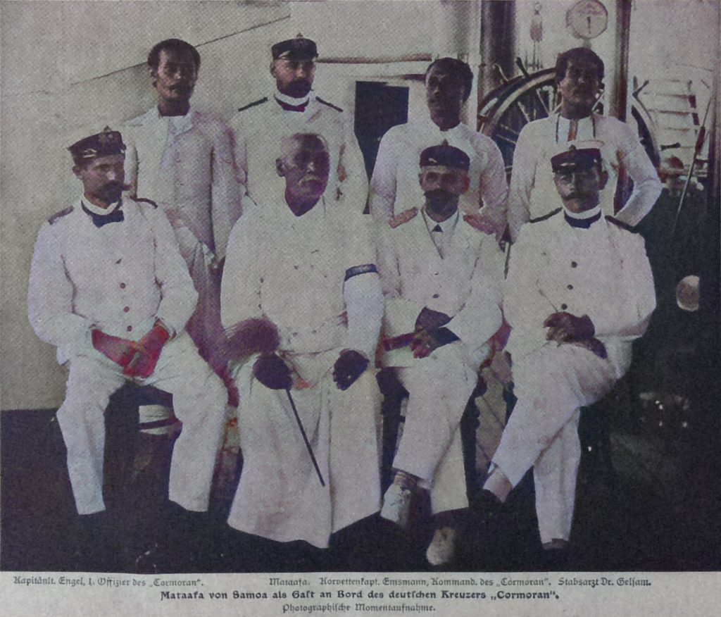 In Samoa ist im Mai d. J. die neue Regierungsform eingeführt. An der Spitze der Regierung steht ein Gouverneur, unter ihm regiert nun Mataafa mit Hilfe vom Volk gewählter Häuptlinge über die Samoaner. Unsere Abbildung zeigt Mataafa an Bord des deutschen Kreuzers „Cormoran“. Obwohl Mataafa im Jahr 1888 gegen die Deutschen gekämpft hat, so ist er doch anderweitig gerade für das Deutschtum eingetreten, und stets hat er den Wunsch geäußert, sich unter deutsche Schutzherrschaft zu stellen.
