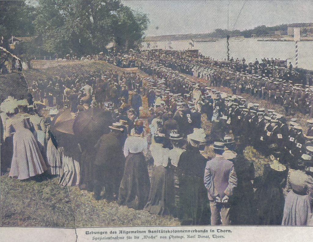 Ein friedlicheres Bild spiegelt unsere Photoaraphie einer Sanitätskolonnenübung in Thorn wieder, wo um die Mitte des vorigen Monats der Allgemeine Sanitätskolonnenverband, dessen Vorsitzender Oberstabsarzt Hering ist, tagte. Es waren Festtage für die alte Hansa- und feste Stadt, und die gesamte Bevölkerung nahm in freudigster Stimmung an den Veranstaltungen teil.