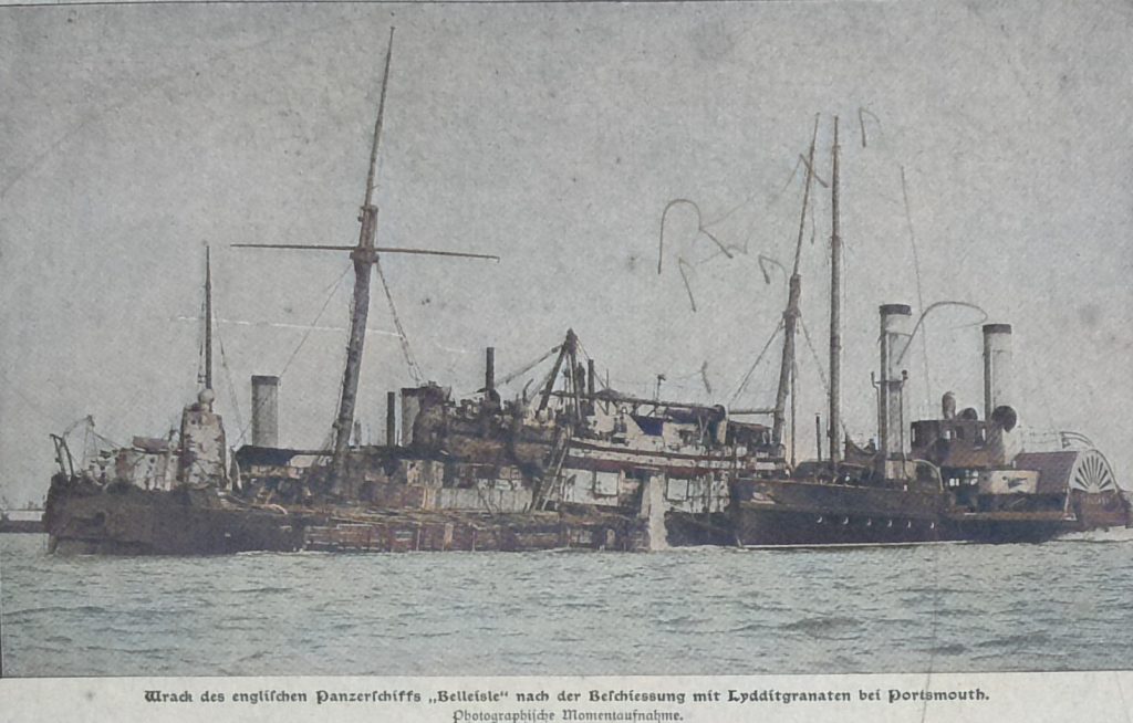 Um die Sprengkraft des Lyddit praktisch zu erproben, hat man in England zu einem interessanten Manöver gegriffen. Das 1876 erbaute und schon veraltete Panzerschiff „Belleisle“ – die glücklichen Engländer haben für so etwas noch Schiffe übrig – wurde als zwar noch immer wertvolles Objekt hierfür zum Opfer erkoren und nachdem es in den Zustand der Kampfbereitschaft versetzt war, von dem ganz neuen Panzerschiff Majestie auf 1800 Meter Entfernung bis zum Sinken beschossen. Die Wirkung des Feuers war, wie unsere Abbildung zeigt, fürchterlich: in acht Minuten war das Schiff gesunken, und von den furchtbaren Wirkungen, die eine Seeschlacht mit dem neuen Sprengstoff haben würde, hat man jetzt den greifbarsten Beweis.