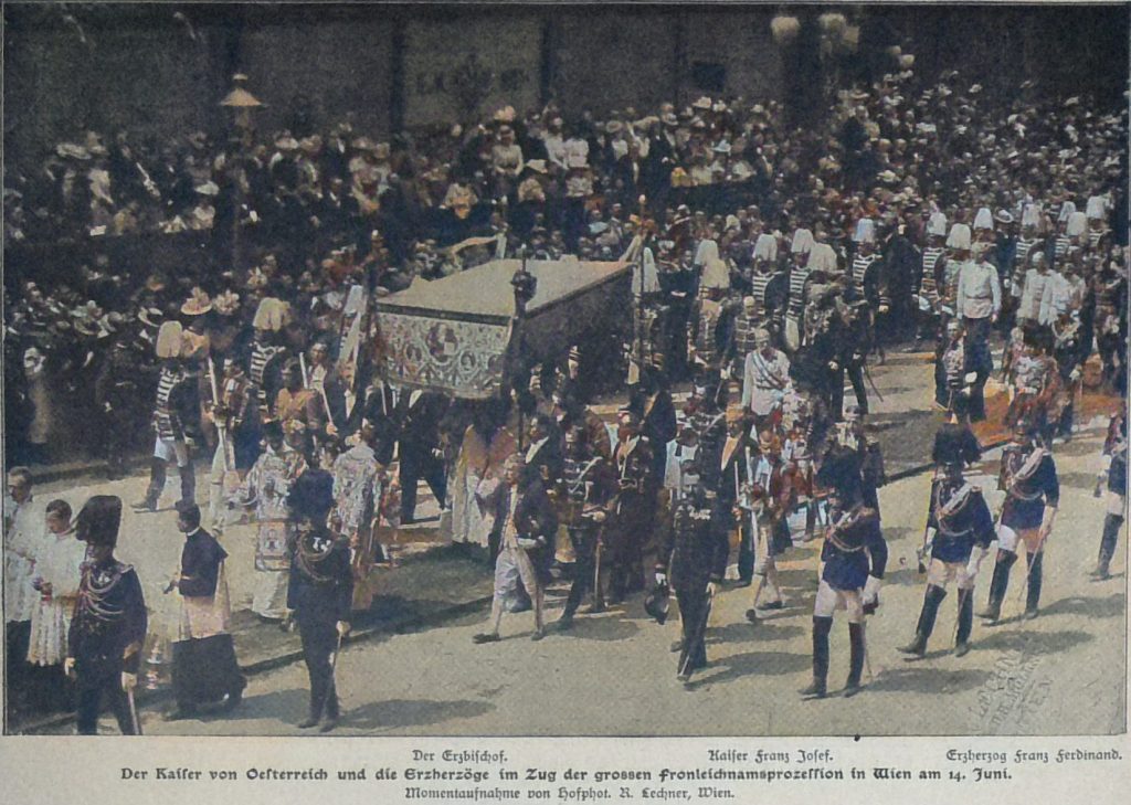 gestaltet sich alljährlich zu einer großen und erhebenden Feier. Dieses glänzendste unter den geistlichen Festen bietet besondere Gelegenheit zur Entfaltung des ehrwürdigen Prunks der katholischen Kirche. Seit seinem Regierungsantritt hat Kaiser Franz Josef, wenn nicht außerordentliche Umstände ihn daran verhinderten, alljährlich an dem großen Fronleichnamsumzug teilgenommen. Unser Bild zeigt den greisen Monarchen, wie er gefolgt von den Erzherzögen, an ihrer Spitze der präsumtive Thronfolger Franz Ferdinand, und unter Vorantritt der hohen Geistlichkeit, durch die teppichbelegten blumenbestreuten und geschmückten Straßen barhäuptig den Weg nach dem ehrwürdigen Stephansdom zurücklegt.
