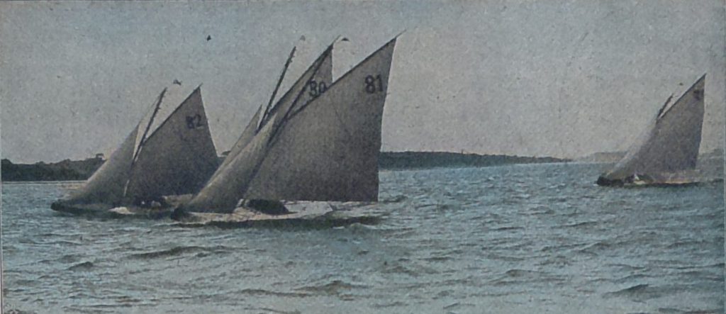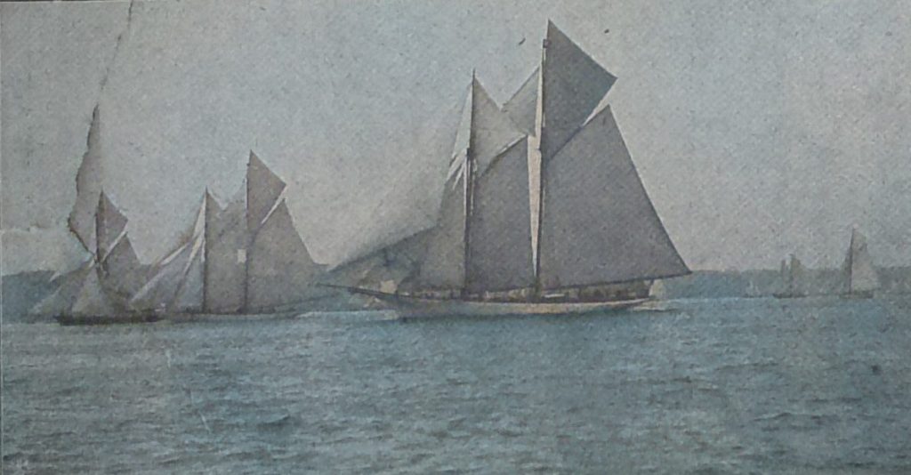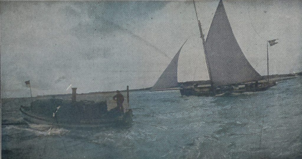 Auf den blauen Fluten der von grünen Buchenhügeln umrahmten Kieler Föhrde herrschte in der vergangenen Woche reges Leben. Von allen Seiten, von England, aus dem deutschen Binnenland waren die schmucken Jachten gekommen und durchfurchten nun mit ihren weißen Segeln wie Schwäne die Bucht, um sich auf ein gegebenes Zeichen in windesschneller Wettfahrt zu messen Galt es doch, wertvolle Preise zu erringen, denn der Kaiser, selbst ein eifriger Liebhaber des Jachtsports, hat in liberalster Weise die einzelnen Rennen mit wertvollen Ehrenpreisen ausgestattet.