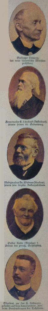 Mit der Neubildung des italienischen Ministeriums hat nach dem Austritt des Kabinetts Pellour König Humbert den mehr als achtzigjährigen Senator Saracco betraut, dem seine Aufgabe verhältnismäßig leicht gelungen ist. Saracco, der neben dem Präsidium selbst das Ministerium des Innern übernimmt, hat die Regierung aus Mitgliedern der bisherigen Mehrheit zusammengesetzt. – In Düsseldorf vollendete der Genremaler Emil Schuback sein achtzigste Lebensjahr. Der hochangesehene Künstler genießt wegen seines liebenswürdigen und bescheidenen Wesens in allen Kreisen die größte Beliebtheit, er hat sich um die Künstlerunterstützungs- und Witwenkasse, sowie um den Bildungsverein besondere Verdienste erworben. – In Krakow in Mecklenburg-Schwerin feierte der wohlverdiente Arzt Medizinalrat Dr. Wiedow sein fünfzigjähriges Doktorjubiläum. Wie ideal er seine Aufgabe auffaßte, seinen leidenden Mitmenschen zu helfen, beweist zur Genüge die Thatsache, daß er während seiner zweiundzwanzigjährigen Praxis die Armen seines Wohnorts stets unentgeltlich und mit unermüdlicher Opferwilligkeit behandelte.