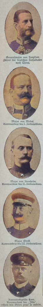 Die deutsche Streitmacht in China wird daher demnächst durch die beiden ersten auf Kriegsstärke gebrachten Seebataillone unter Führung des Generalmajors v. Hoepfner vermehrt werden. Mit hinaus zieht Major v. Kronhelm, der Kommandeur des zweiten Bataillons, während Major v. Madai, der Kommandeur des ersten, möglicherweise in der Heimat bleibt, um den General v. Hoepfner in seiner Eigenschaft als Inspekteur der Marine-Infanterie zu vertreten. Das dritte Seebataillon, dessen Kommandant seit März dieses Jahres Major Christ ist, steht bekanntlich in Tsintau.
