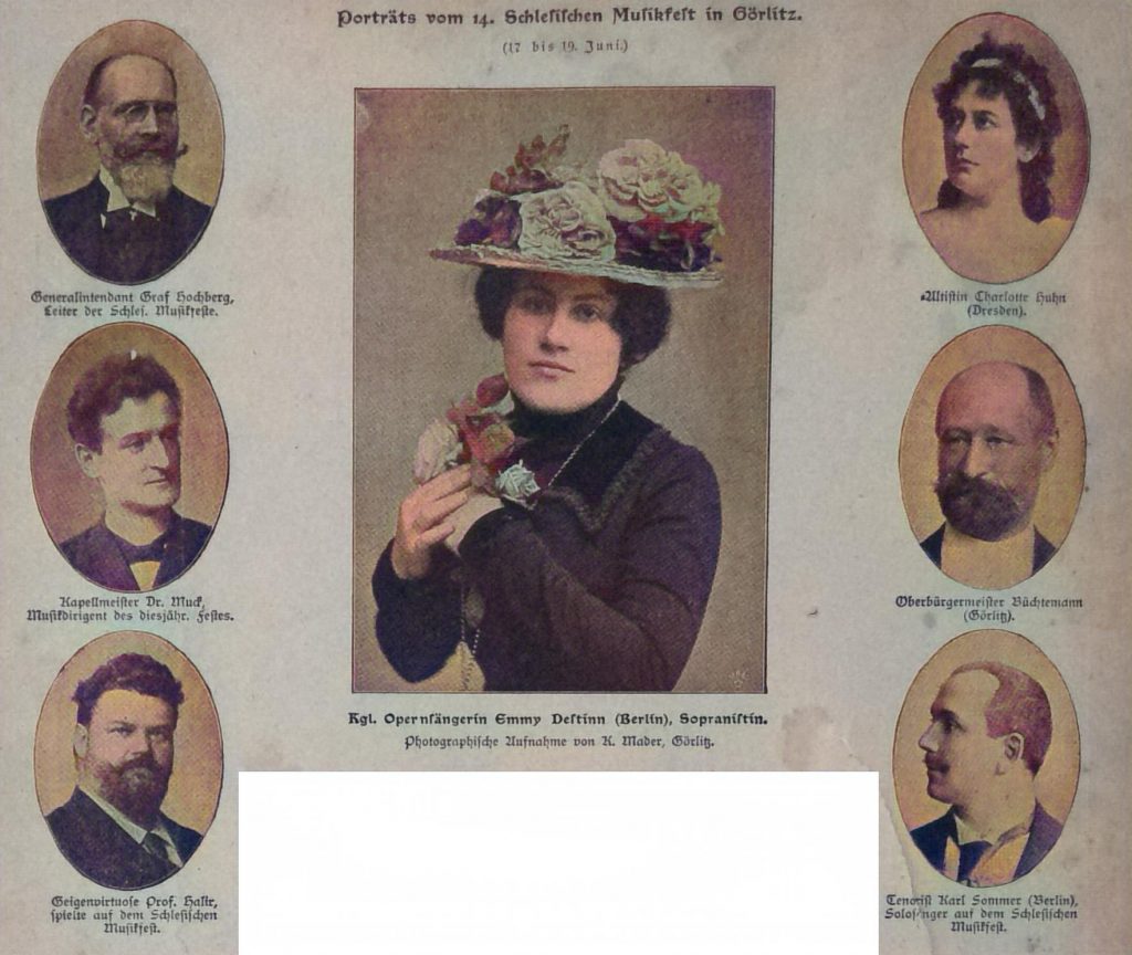 ist vorüber, und alle, die daran teilgenommen haben, sind mit seinem Verlauf zufrieden. Oberbürgermeister Büchtemann, der Vorsitzende des Komitees, konnte die für die Fortführung der Feste in Görlitz erfreuliche Mitteilung machen, daß zum Bau einer Musikhalle bereits 300 000 Mark aufgebracht seien, die der Protektor, Generalintendant Graf Hochberg, der Stadt zur Verfügung gestellt habe. Die Aufführungen, unter Leitung des Königlichen Kapellmeisters Dr. Muck, waren durchweg vorzüglich und wurden von dem überaus zahlreichen Publikum mit rauschendem Beifall aufgenommen. Neben dem Festdirigenten wurden auch die Solisten in wahrhaft begeisterter Weise ausgezeichnet. Es waren aus Berlin: die treffliche Sopranistin Frl. Emmy Destinn, die zum erstenmal zur Mitwirkung bei einer solch großen Veranstaltung herangezogen wurde, der Tenorist Kurt Sommer und der Geigenkünstler Professor Halir, denen sich die Dresdener Altistin Frl. Charlotte Huhn erfolgreich an die Seite stellte.