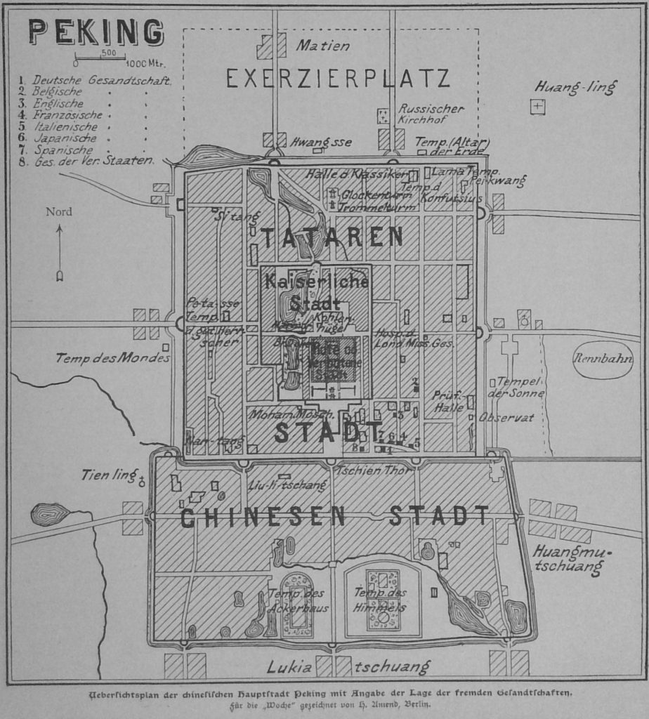 In der Hauptstadt Peking, deren eigenartige Anlage der untenstehende Plan veranschaulicht, werden die Gesandten ebenfalls von den Chinesen in der sogenannten Gesandtschaftstraße blockiert, während aus der eigentlichen Mandschustadt, dem Sitz der Dynastie, nur dunkle Gerüchte von den Entschließungen der Kaiserin in die Öffentlichkeit dringen.